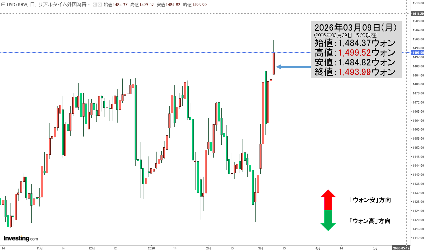 2026年03月09日(月)15:30現在、ドルウォンのチャートは以下のようになっています(チャートは『Investing.com』より引用)。