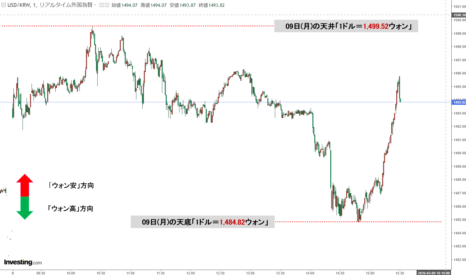 風雲急を告げております。現在のところ「1ドル=1,493ウォン」近辺の攻防で、本日の見どころは「1ドル=1,500ウォン」突破確定できるか――です。