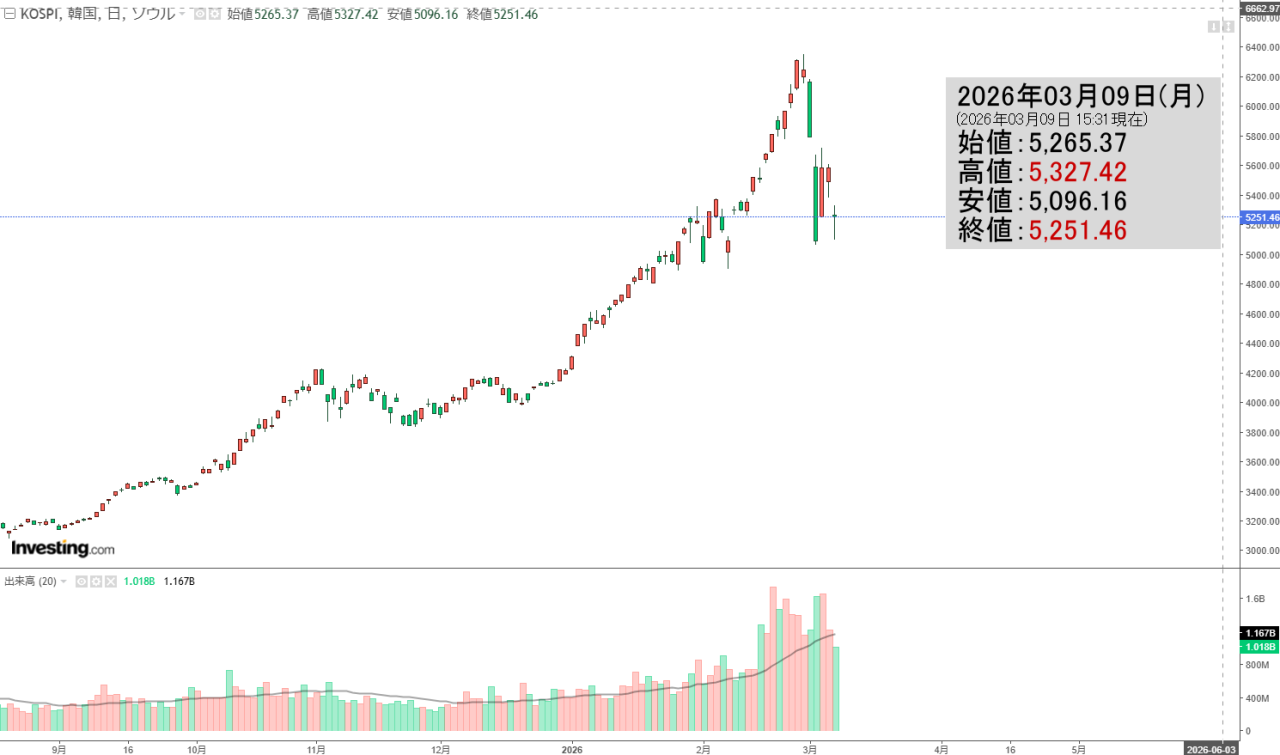 2026年03月09日(月)の韓国株式市場が締まりました。15:31現在、KOSPI(韓国総合株価指数)のチャートは以下のようになっています(チャートは『Investing.com』より引用)。