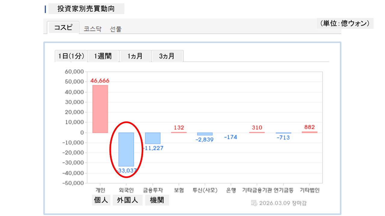 個人投資家は「4兆6,666億ウォン」の買い越し外国人投資家は「3兆3,037億ウォン」の売り越しです。
