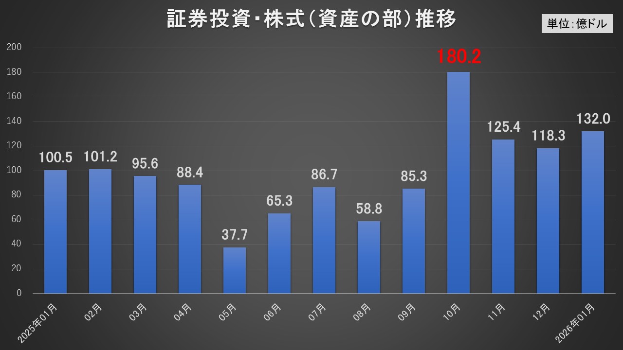 ↑国際収支統計の金融収支⇒証券投資⇒株式投資(資産の部)の2025年01月~2026年01月の推移。