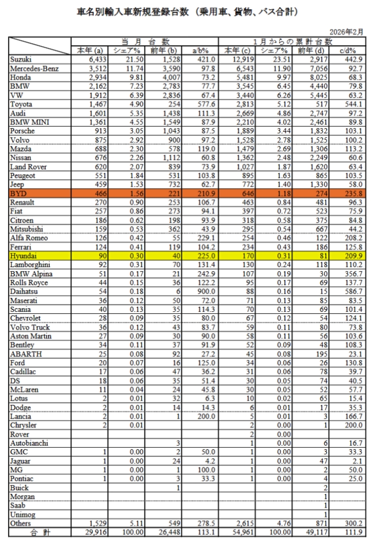 2026年03月05日、『日本自動車輸入組合』が輸入車新規登録台数(速報)を公表しました。2026年02月、中国の電気自動車メーカー『BYD』、韓国の『現代自動車』の日本市場での動向を見てみましょう。