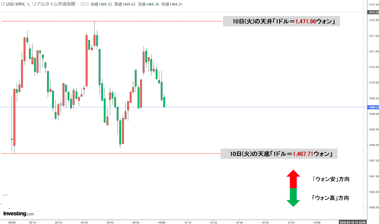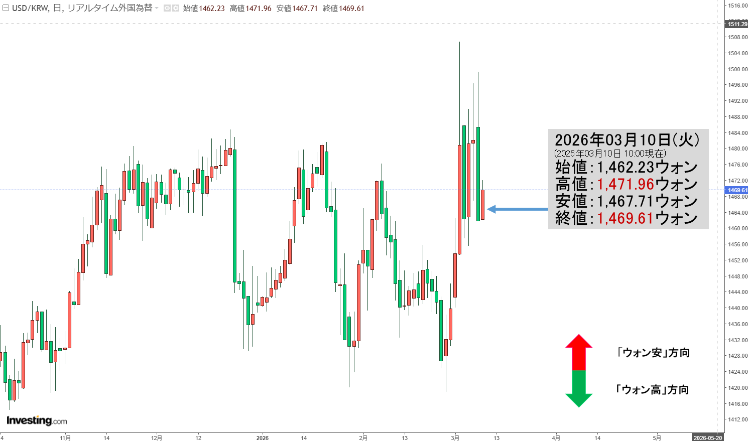 2026年03月10日(火)の市場が開きました。10:00現在、ドルウォンのチャートは以下のようになっています(チャートは『Investing.com』より引用)。