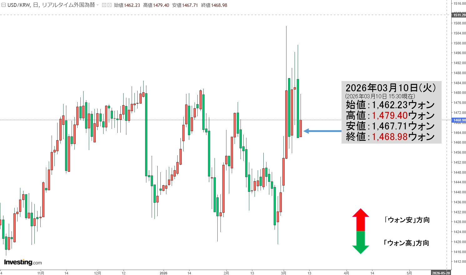 2026年03月10日(火)15:30現在、ドルウォンのチャートは以下のようになっています(チャートは『Investing.com』より引用)。
