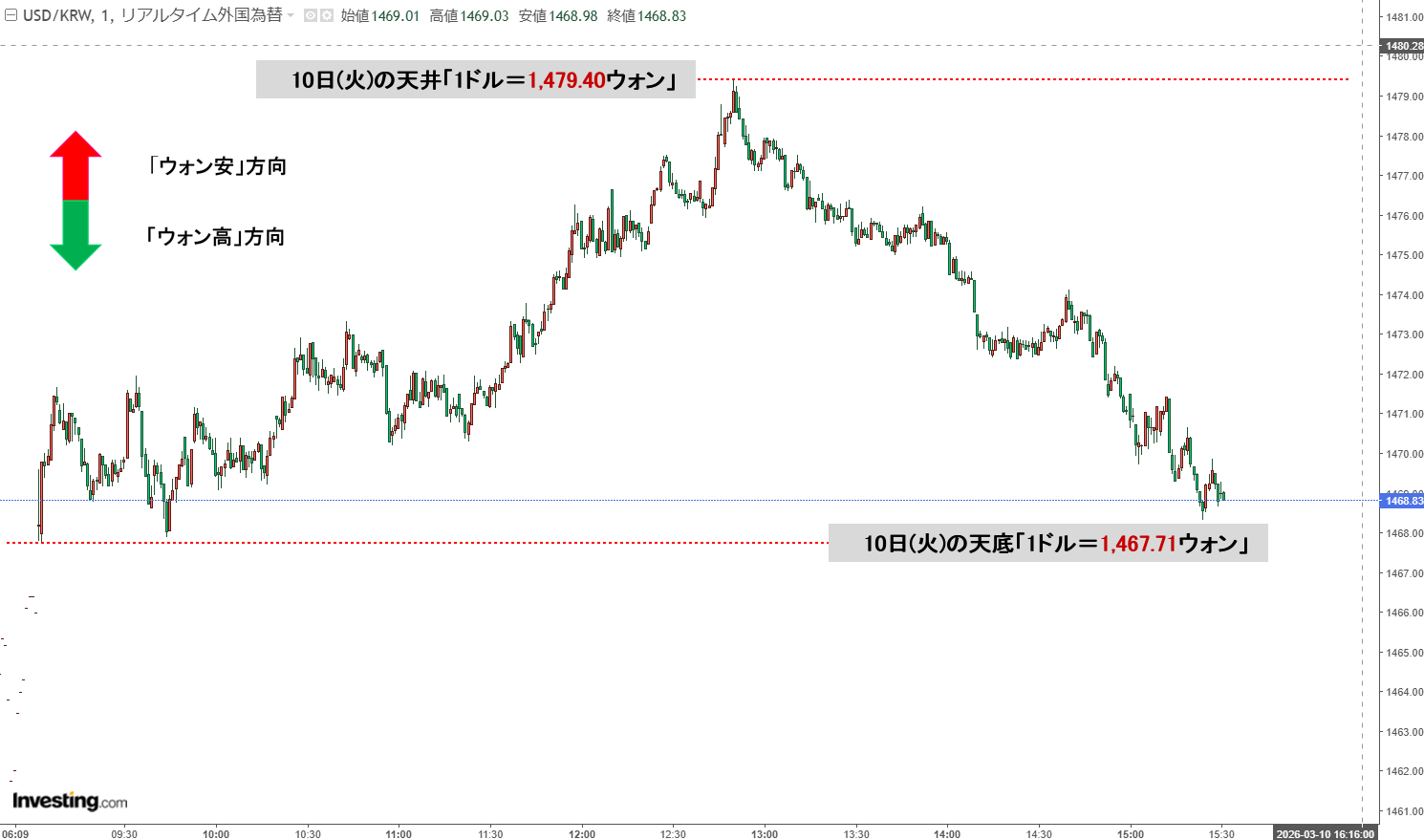 現在のところ「1ドル=1,468ウォン」近辺の攻防となっています。