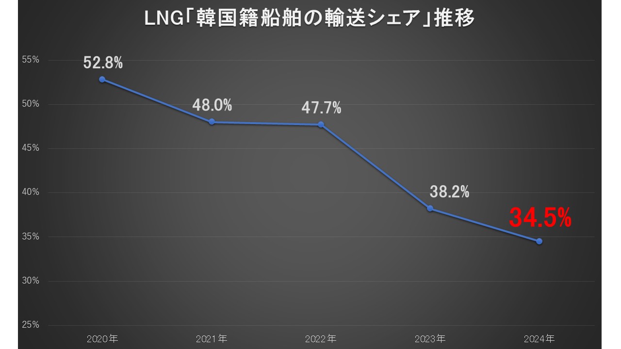 2020年には50%を超えていたのですが、2024年には全輸送量のうち韓国籍の船舶のシェアは34.5%まで低下しています。
