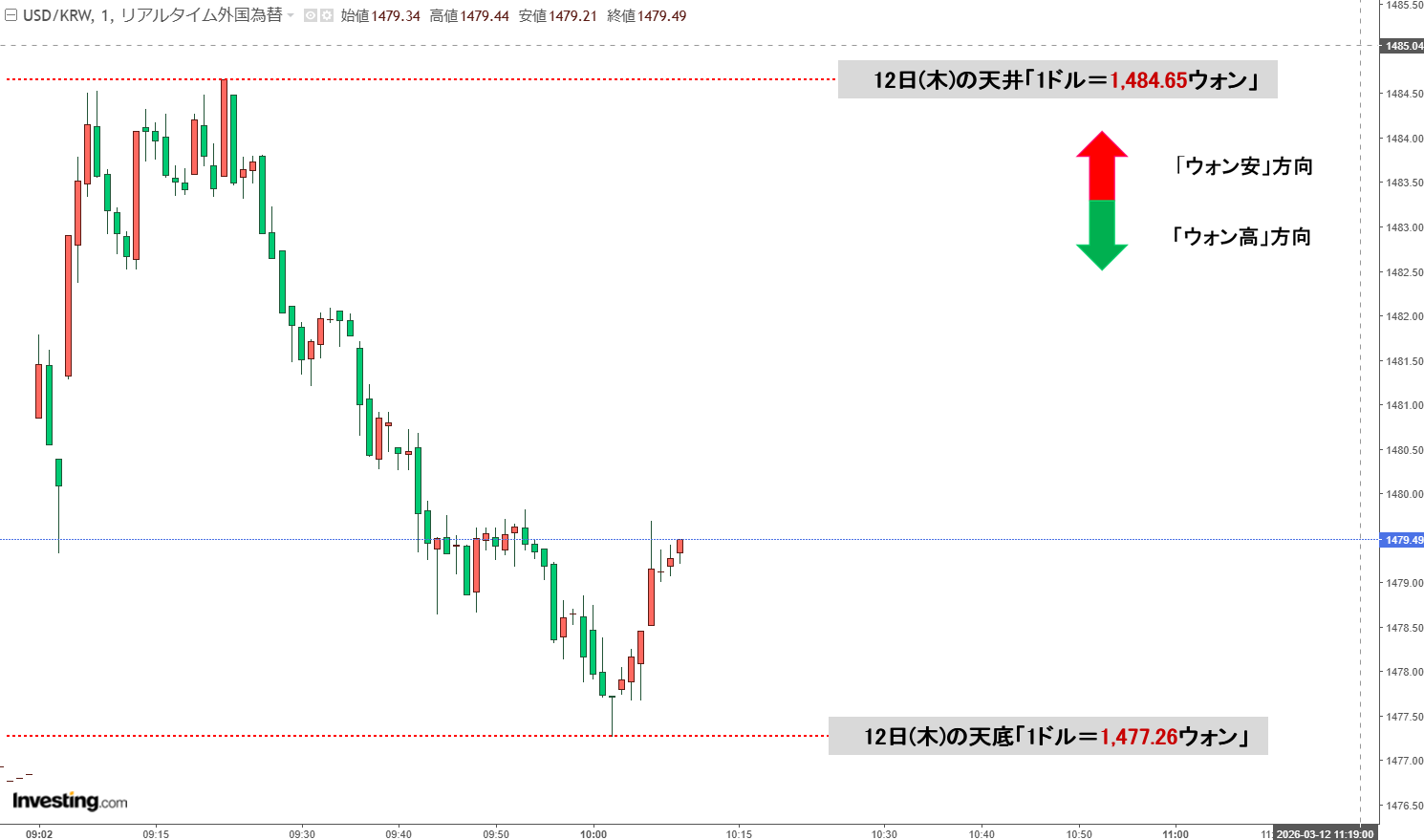 2026年03月12日(木)の市場が開きました。10:08現在、ドルウォンのチャートは以下のようになっています(チャートは『Investing.com』より引用)。