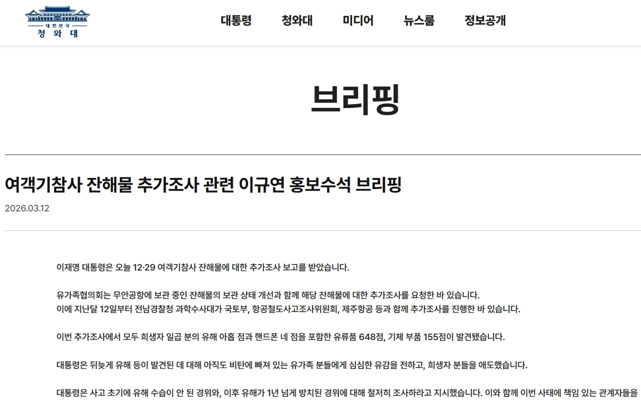 李在明(イ・ジェミョン)大統領は本日、12・29旅客機惨事の残骸物に対する追加調査の報告を受けました。