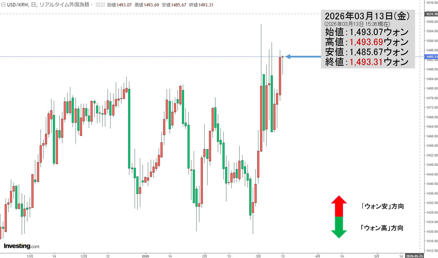 ローソク足の調整が入りました。前日の終値は「1ドル=1,493ウォン」となり、本日がどこで締まるかです。