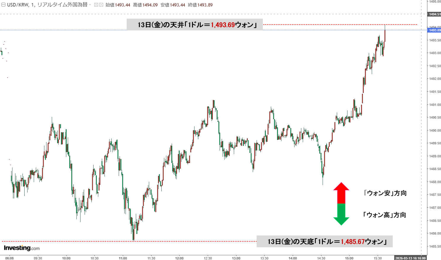 2026年03月13日(金)15:36現在、ドルウォンのチャートは以下のようになっています(チャートは『Investing.com』より引用)。
