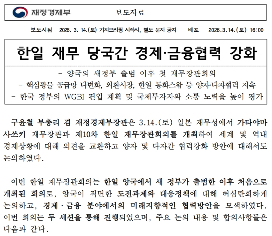 1. 片山さつき日本国財務大臣及び具潤哲(ク・ユンチョル)韓国副総理兼財政経済部長官は、2026年03月14日に東京にて第10回日韓財務大臣級対話を開催した。