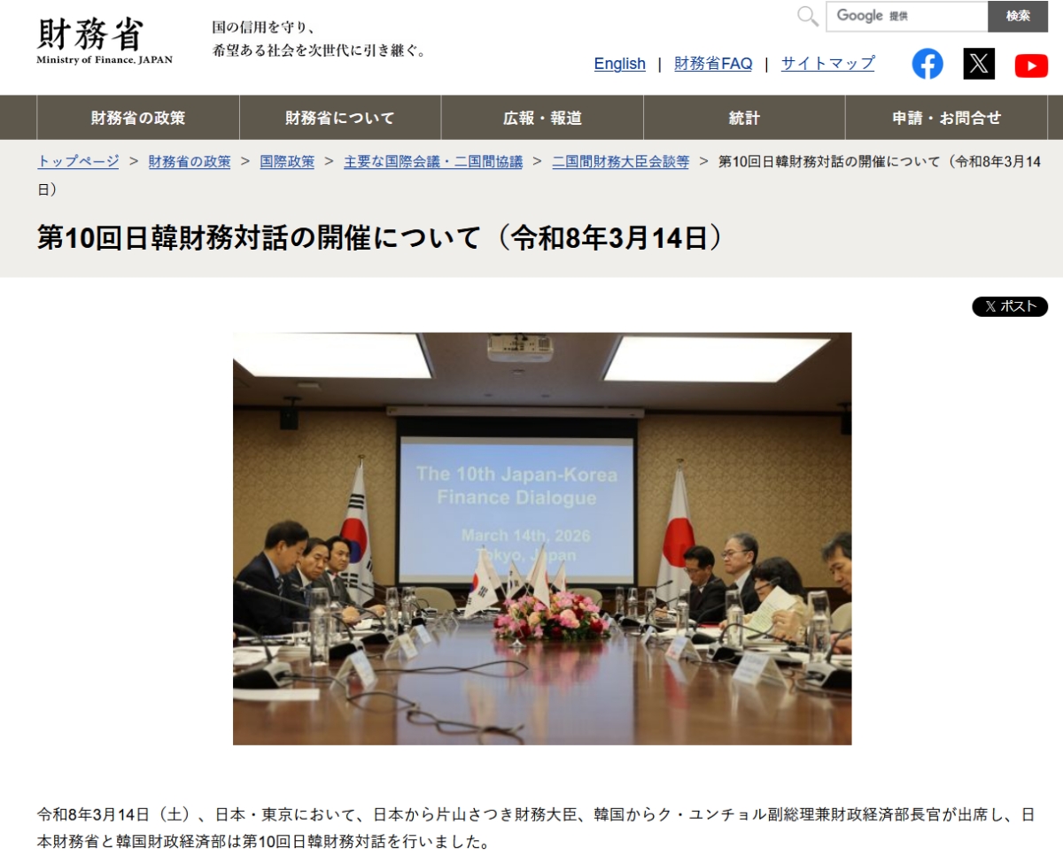 ⇒参照・引用元:『日本国 財務省』公式サイト「第10回日韓財務対話の開催について(令和8年3月14日)」