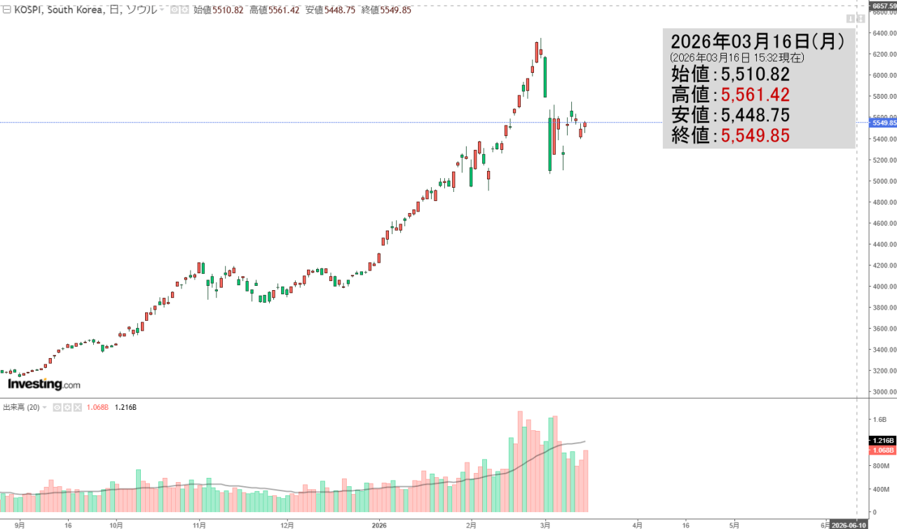 2026年03月16日(月)の韓国株式市場が締まりました。15:32現在、KOSPI(韓国総合株価指数)のチャートは以下のようになっています(チャートは『Investing.com』より引用)。