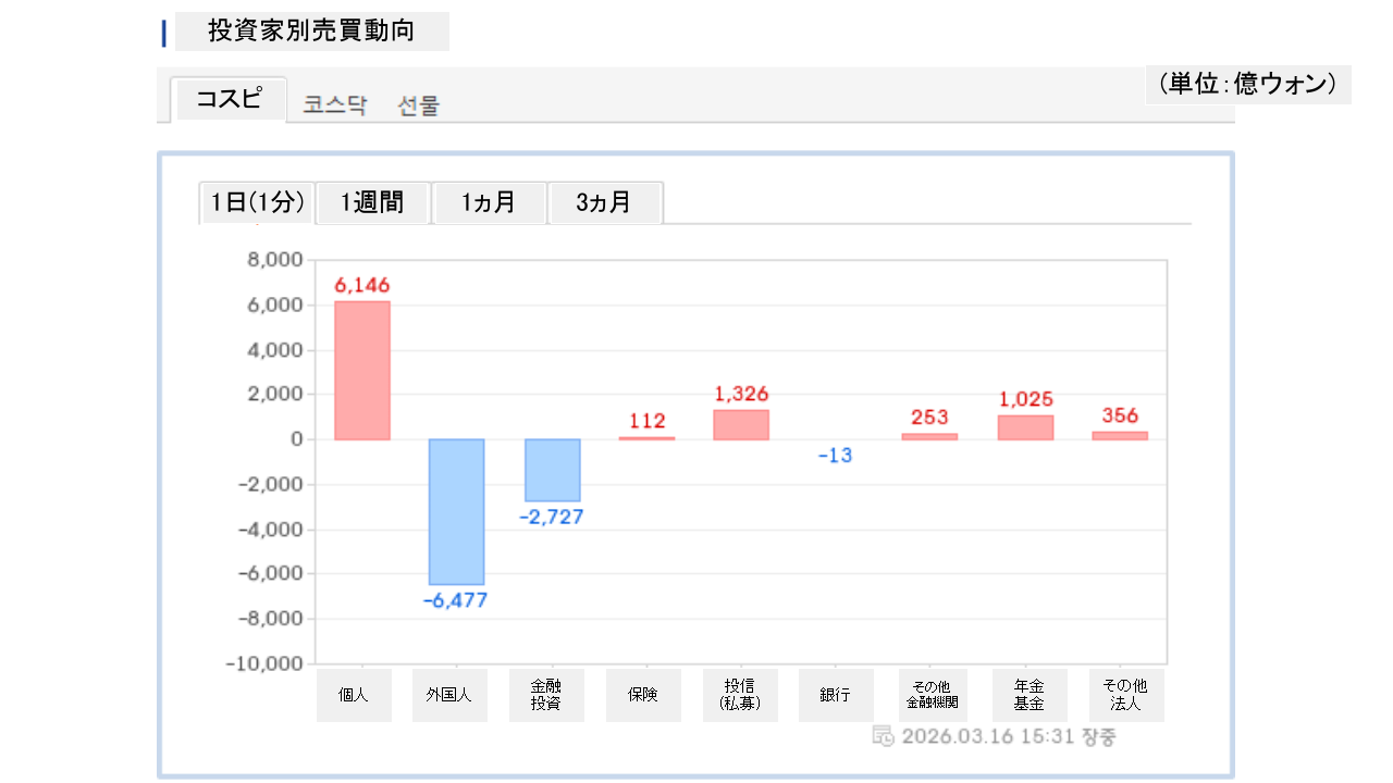 個人投資家は「6,146億ウォン」の買い越し外国人投資家は「6,477億ウォン」の売り越しです。