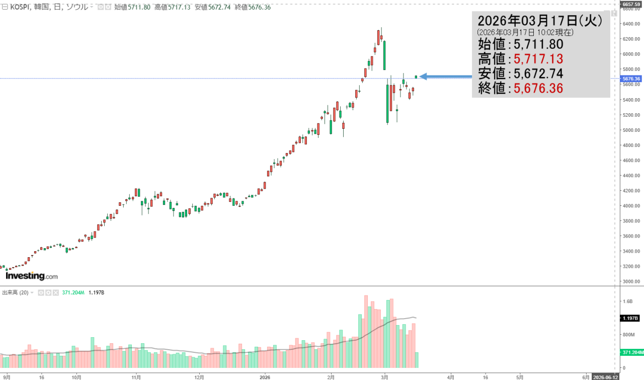 2026年03月17日(火)の韓国株式市場が開きました。10:02現在、KOSPI(韓国総合株価指数)のチャートは以下のようになっています(チャートは『Investing.com』より引用)。