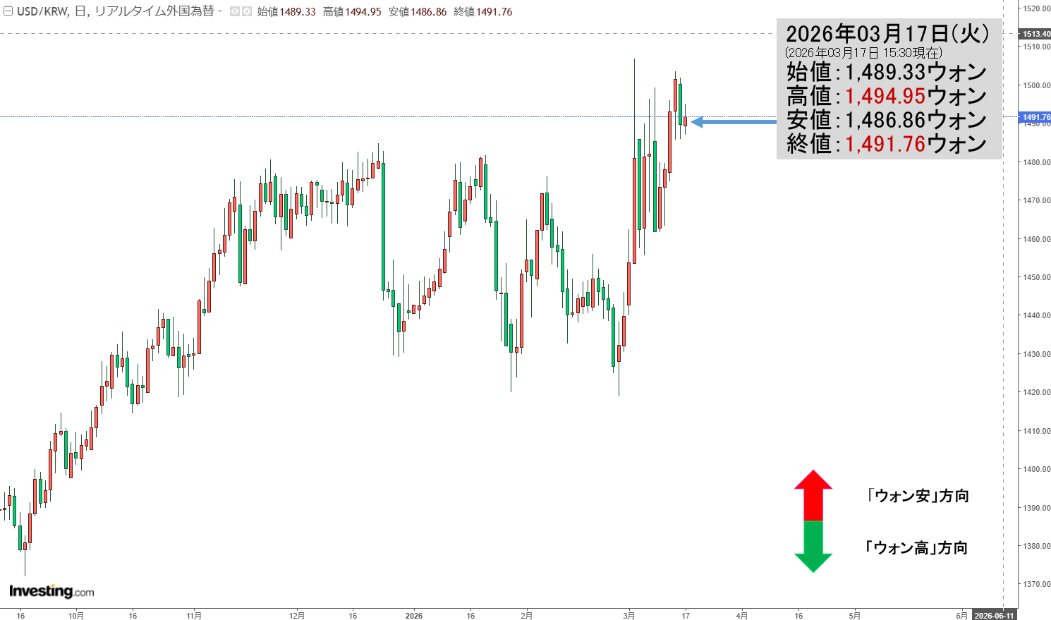現在のところ「1ドル=1,491ウォン」近辺の攻防となっています。