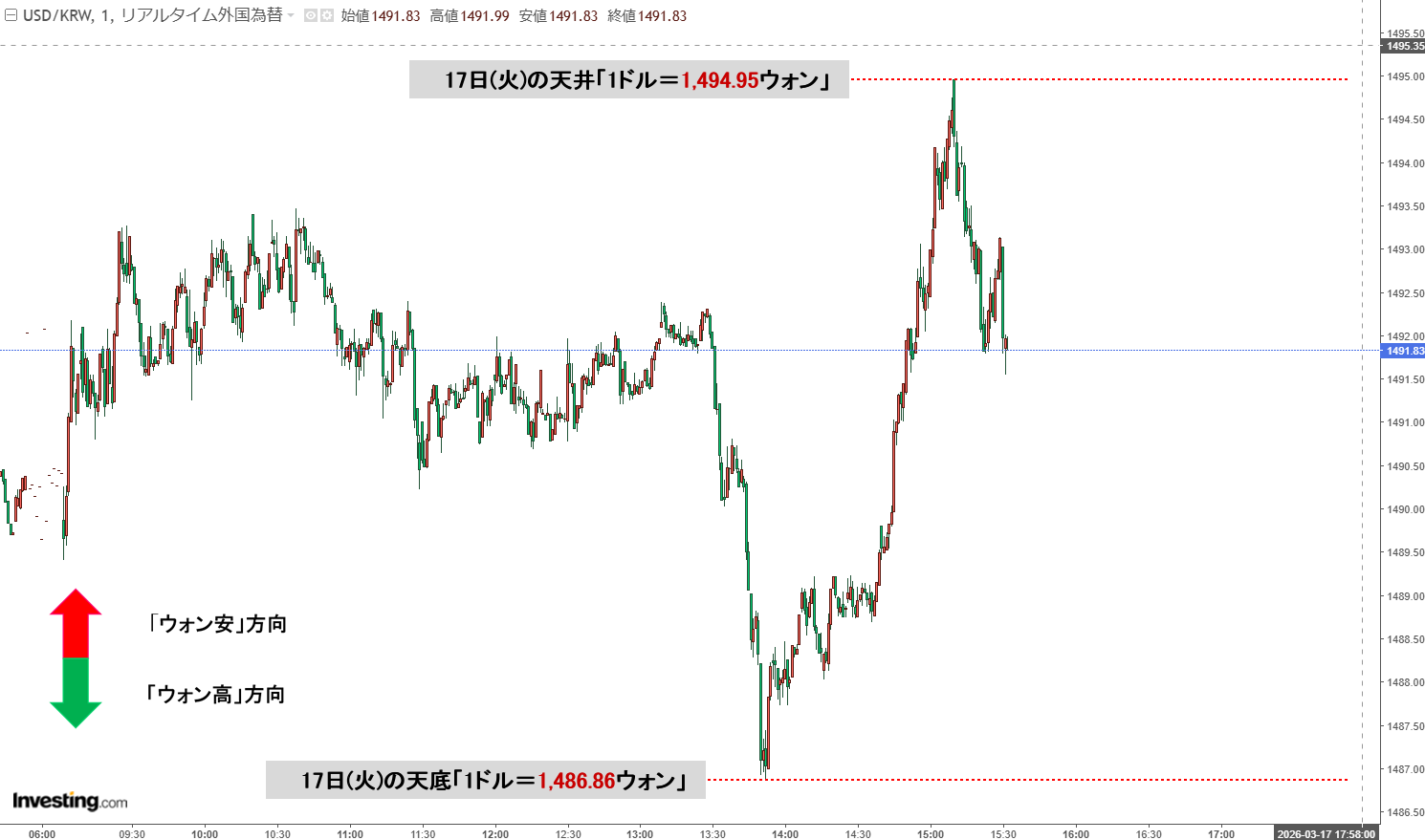 現在の天井は「1ドル=1,494.95ウォン」、天底は「1ドル=1,486.86ウォン」です。