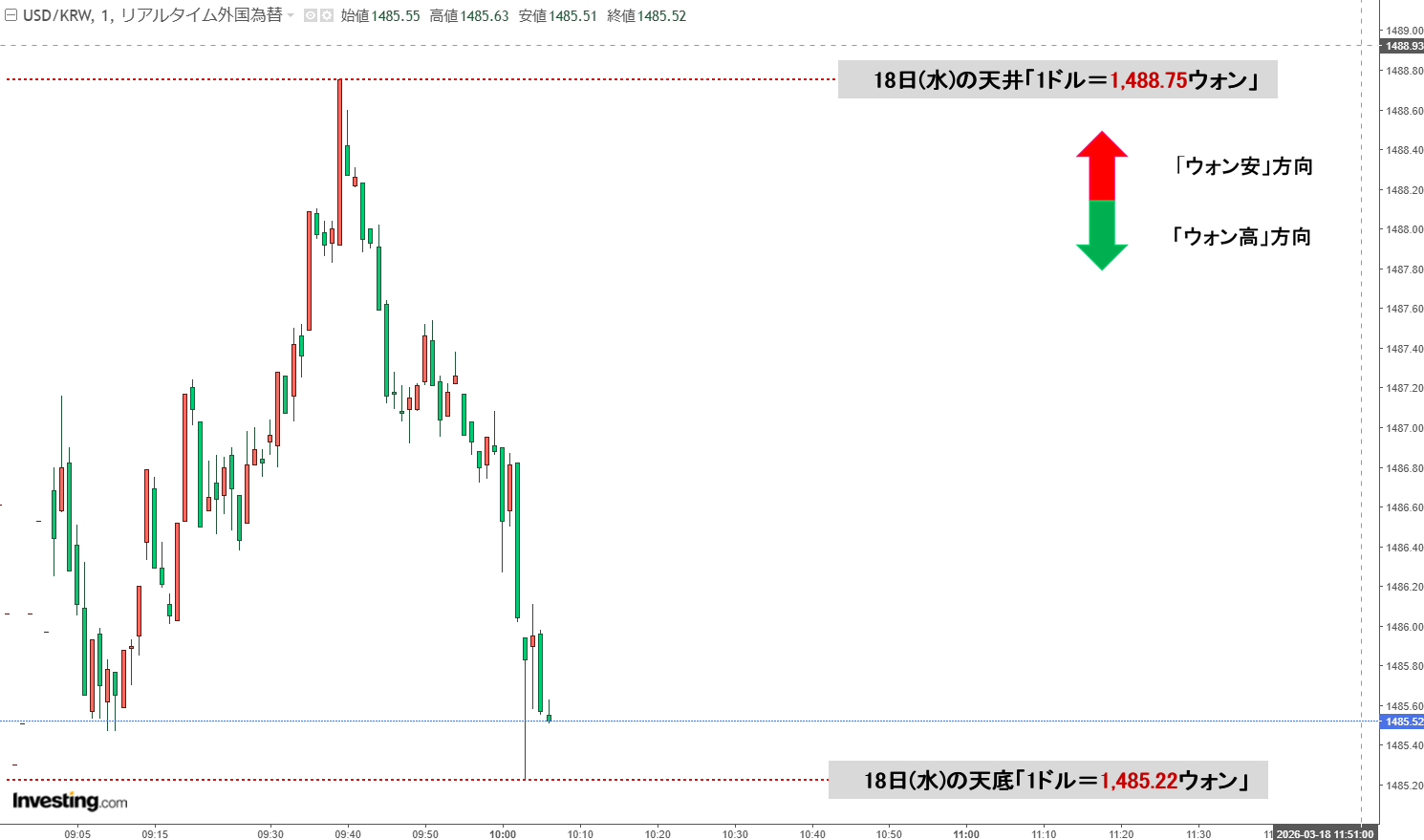 2026年03月18日(水)の市場が開きました。10:05現在、ドルウォンのチャートは以下のようになっています(チャートは『Investing.com』より引用)。