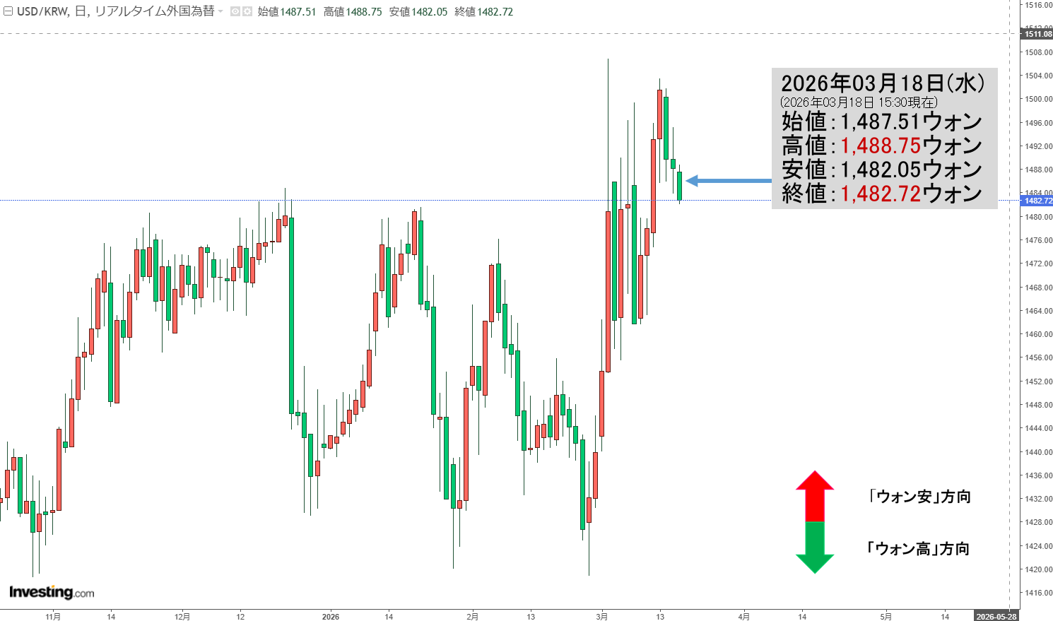 2026年03月18日(水)15:30現在、ドルウォンのチャートは以下のようになっています(チャートは『Investing.com』より引用)。