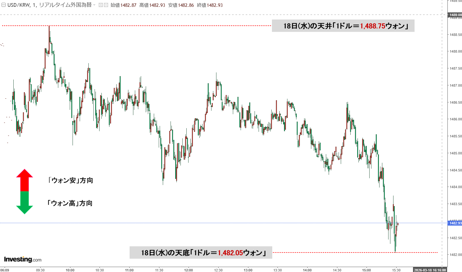 現在の天井は「1ドル=1,488.75ウォン」、天底は「1ドル=1,482.05ウォン」です。