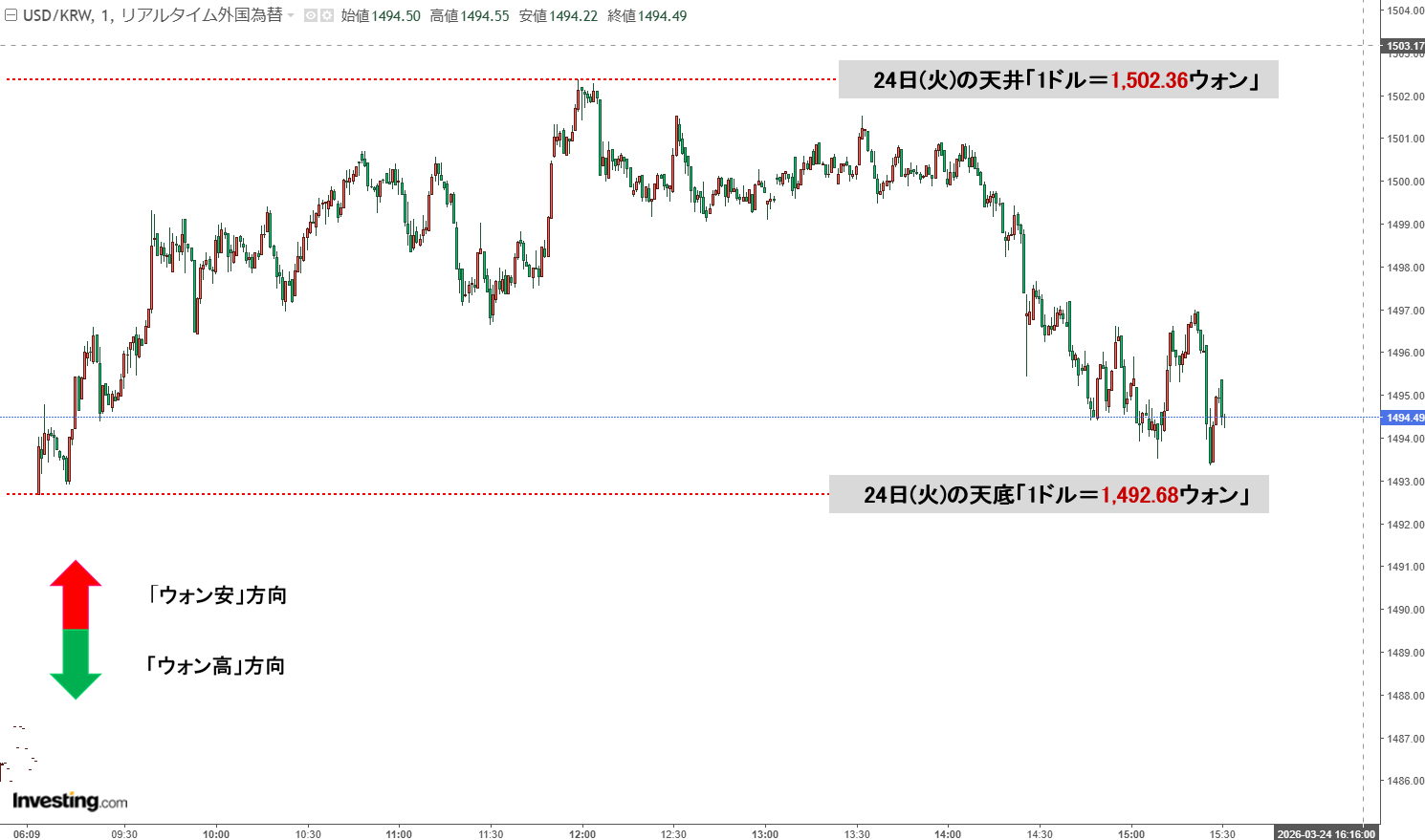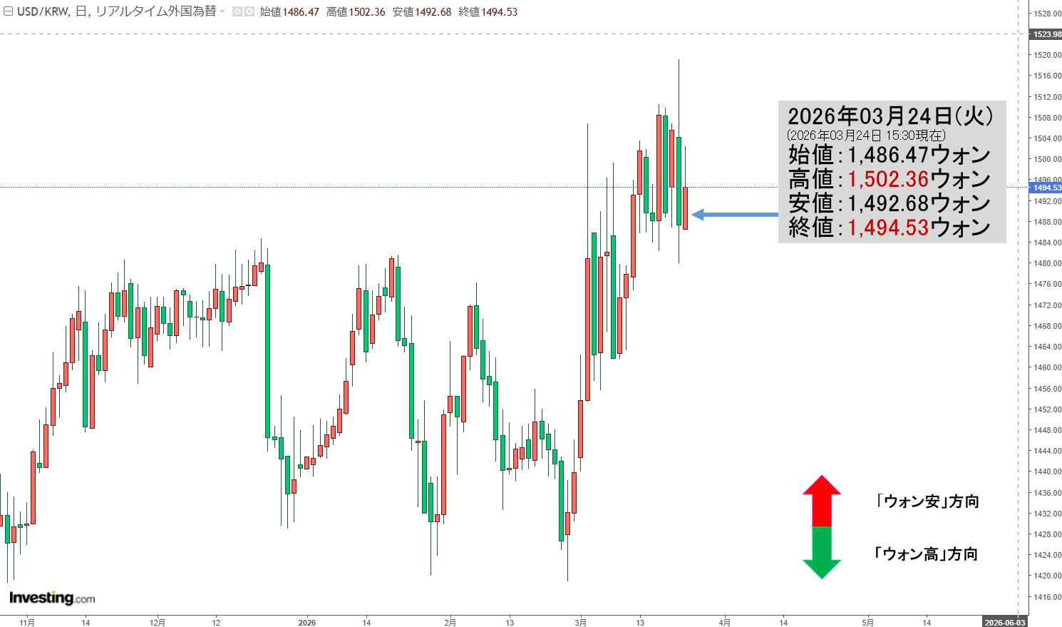 2026年03月24日(火)15:30現在、ドルウォンのチャートは以下のようになっています(チャートは『Investing.com』より引用)。
