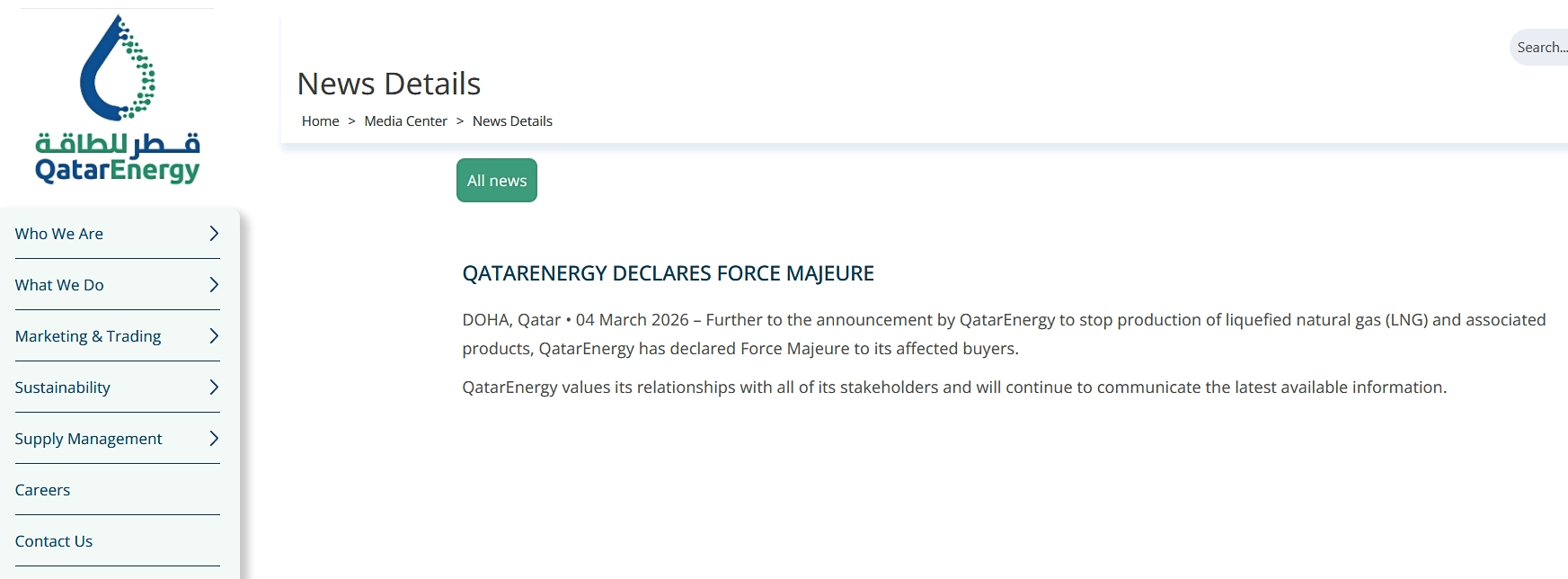 カタール・ドーハ • 2026年3月4日 – カタールエナジーが液化天然ガス(LNG)および関連製品の生産停止を発表したことに続き、カタールエナジーは影響を受ける買い手に対して不可抗力(Force Majeure)を宣言した。カタールエナジーはすべての利害関係者との関係を重視しており、引き続き入手可能な最新情報の伝達を行っていく。