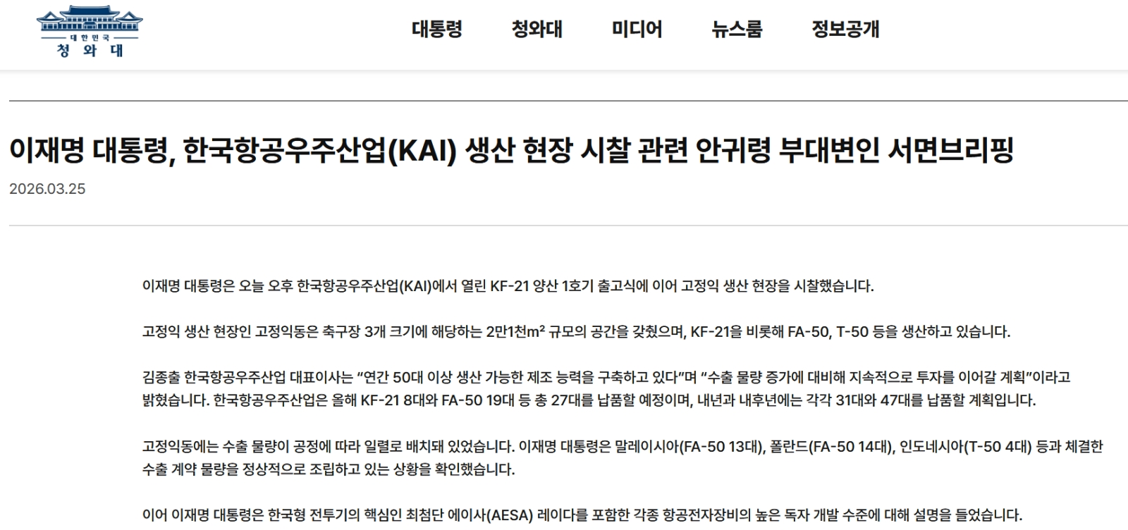 李在明(イ・ジェミョン)大統領、『韓国航空宇宙産業』(KAI)生産現場視察に関する安貴朎(アン・グィリョン)副報道官書面ブリーフィング