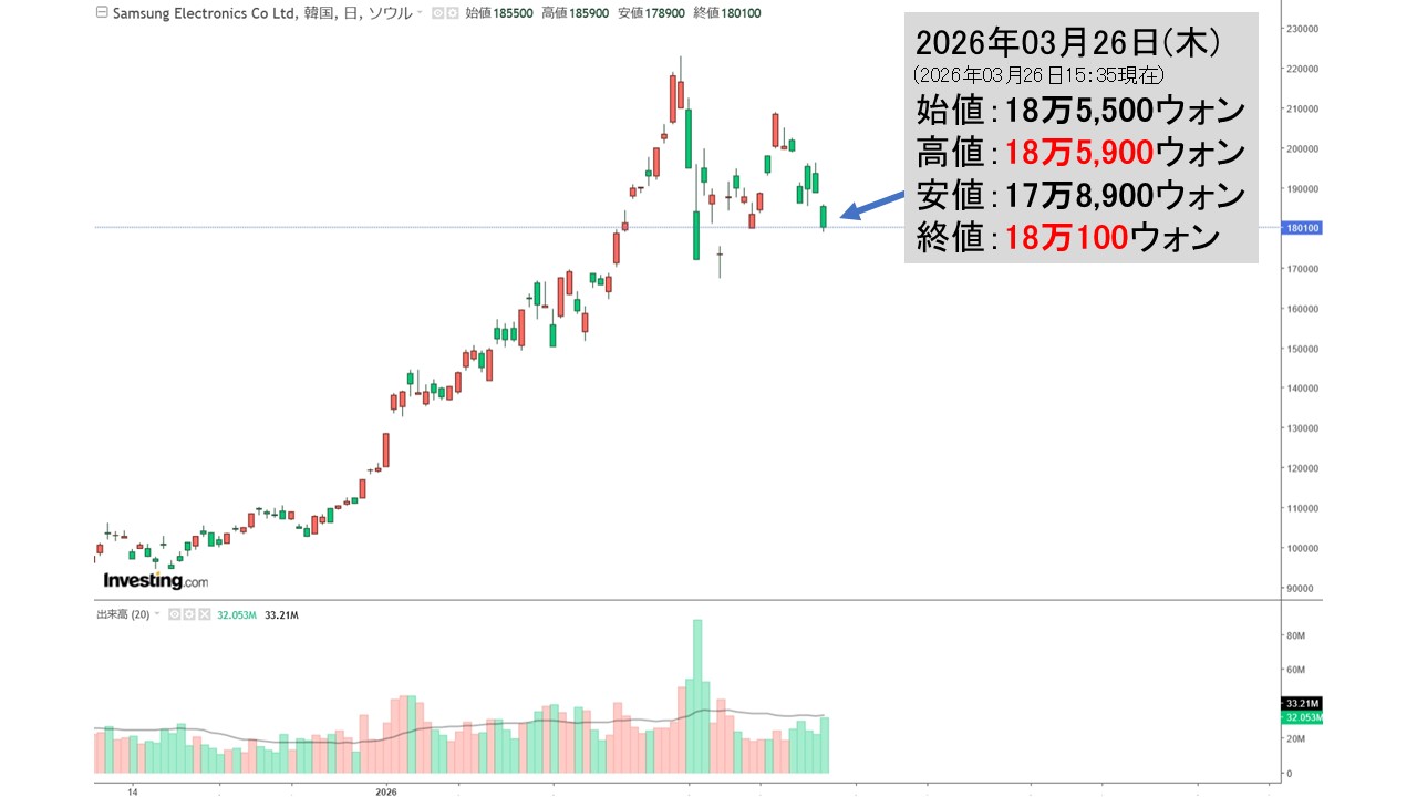 2026年03月27日、韓国の半導体企業『サムスン電子』の株価が以下のように急落しましたイ(チャートは『Investing.com』より引用:以下同)。