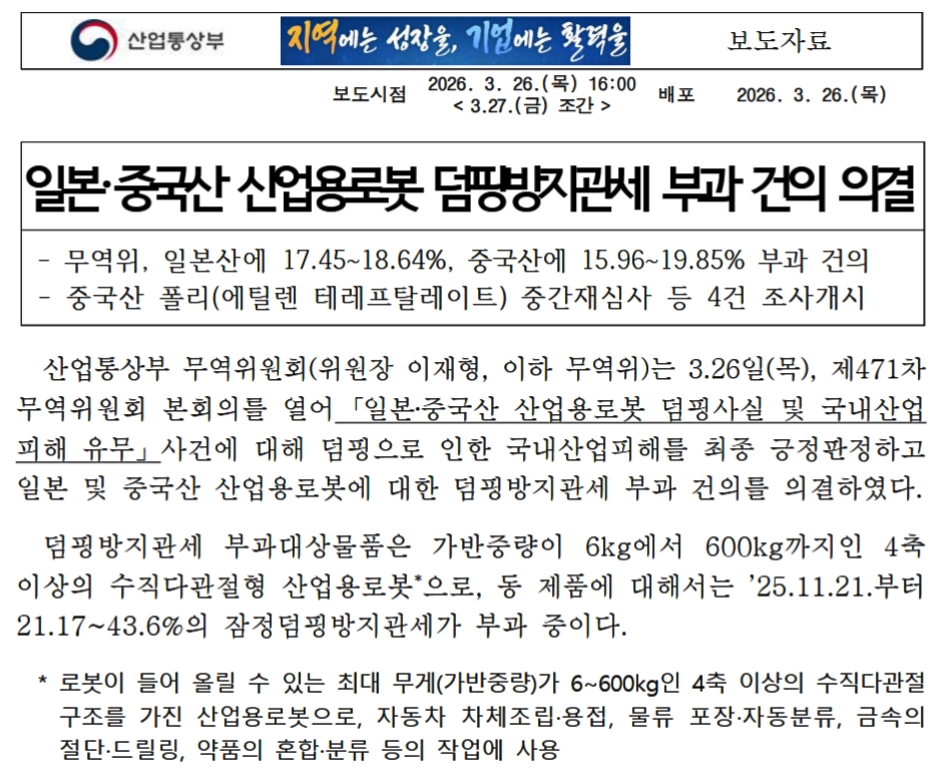 中国産ポリ(エチレンテレフタレート)中間再審査など4件の調査開始産業通商部貿易委員会(委員長 イ・ジェヒョン、以下 貿易委)は03月26日(木)、第471回貿易委員会本会議を開催し、「日本・中国産産業用ロボットのダンピング事実および国内産業被害の有無」事件について、ダンピングによる国内産業被害を最終的に肯定判定し、日本および中国産産業用ロボットに対するアンチダンピング関税賦課の建議を議決した。