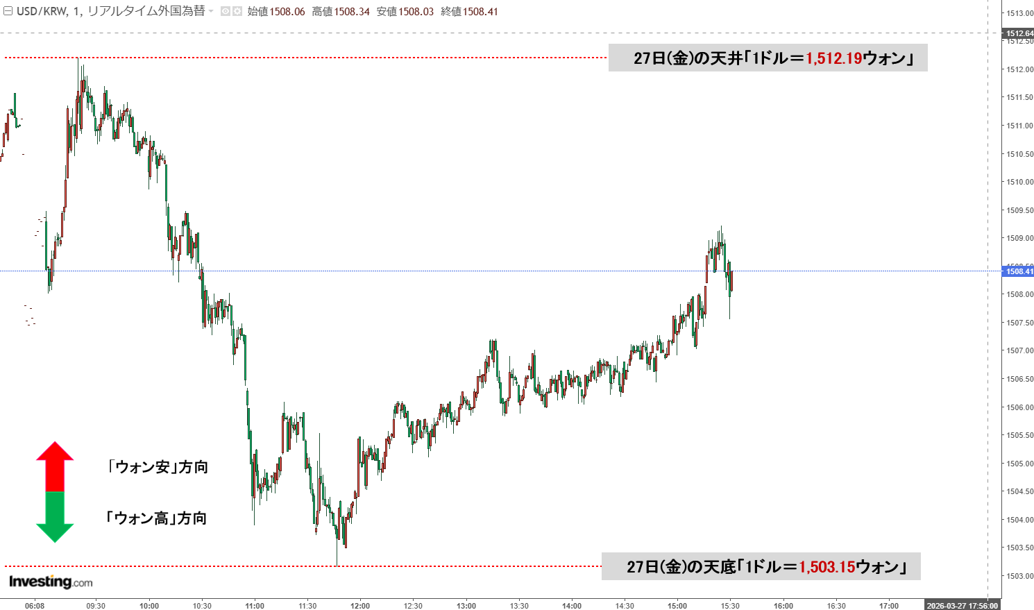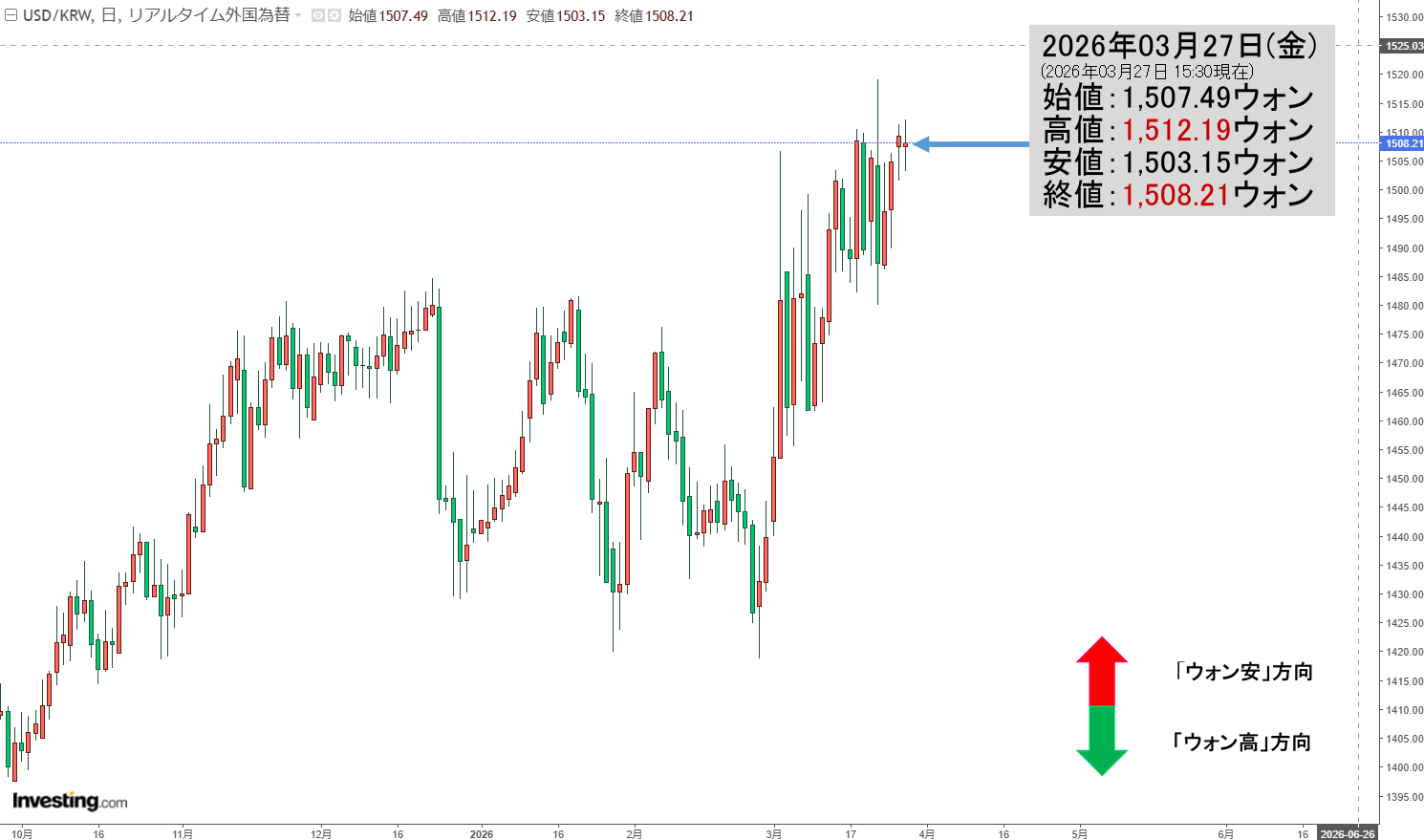 2026年03月27日(金)15:30現在、ドルウォンのチャートは以下のようになっています(チャートは『Investing.com』より引用)。