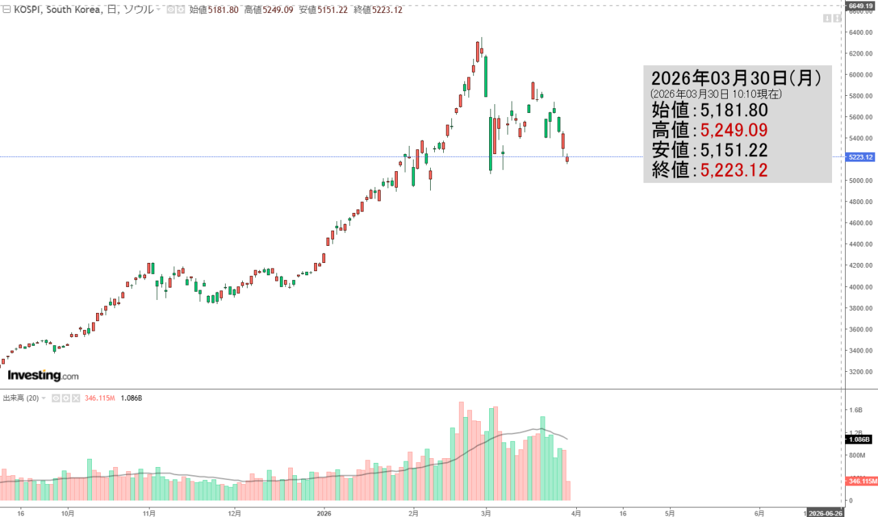 2026年03月30日(月)の韓国株式市場が開きました。10:10現在、KOSPI(韓国総合株価指数)のチャートは以下のようになっています(チャートは『Investing.com』より引用)。