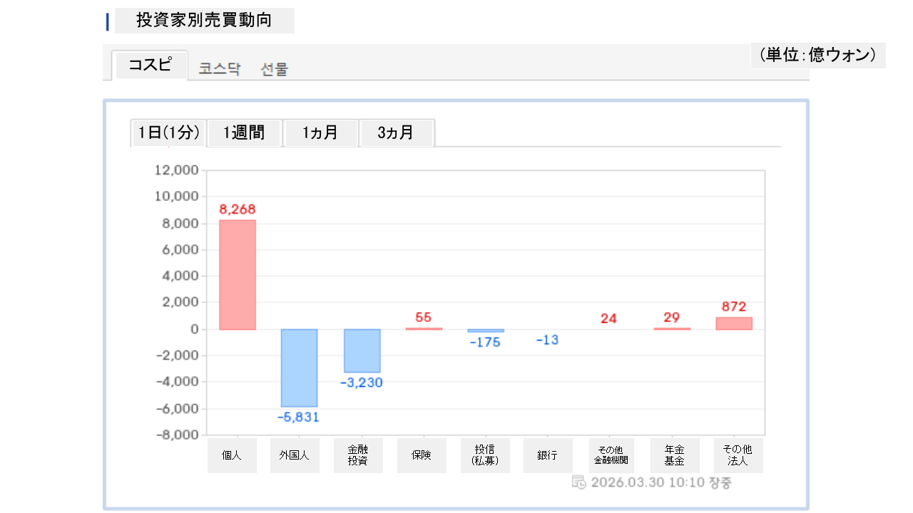 個人投資家は「8,268億ウォン」の買い越し、外国人投資家は「5,831億ウォン」の売り越しです。