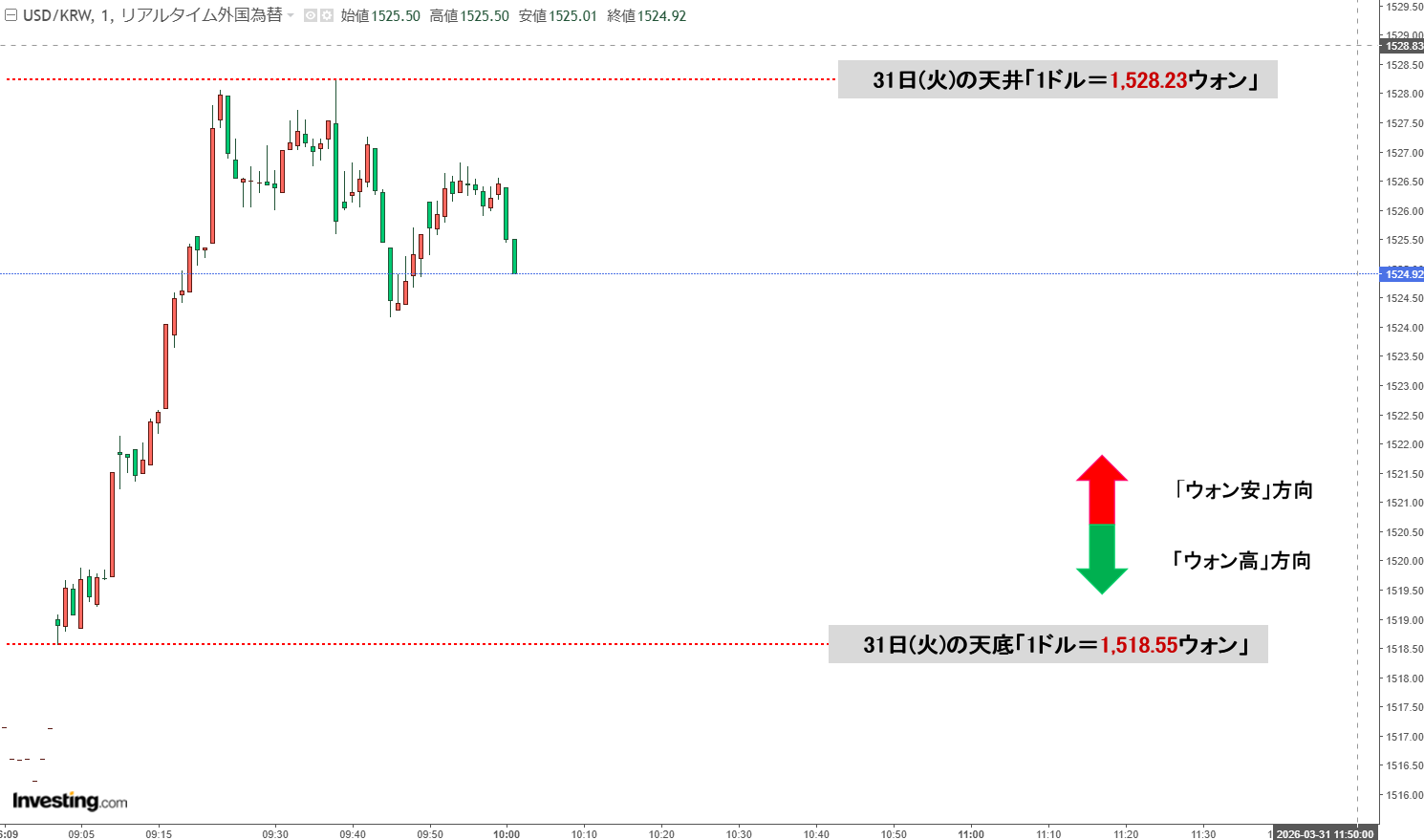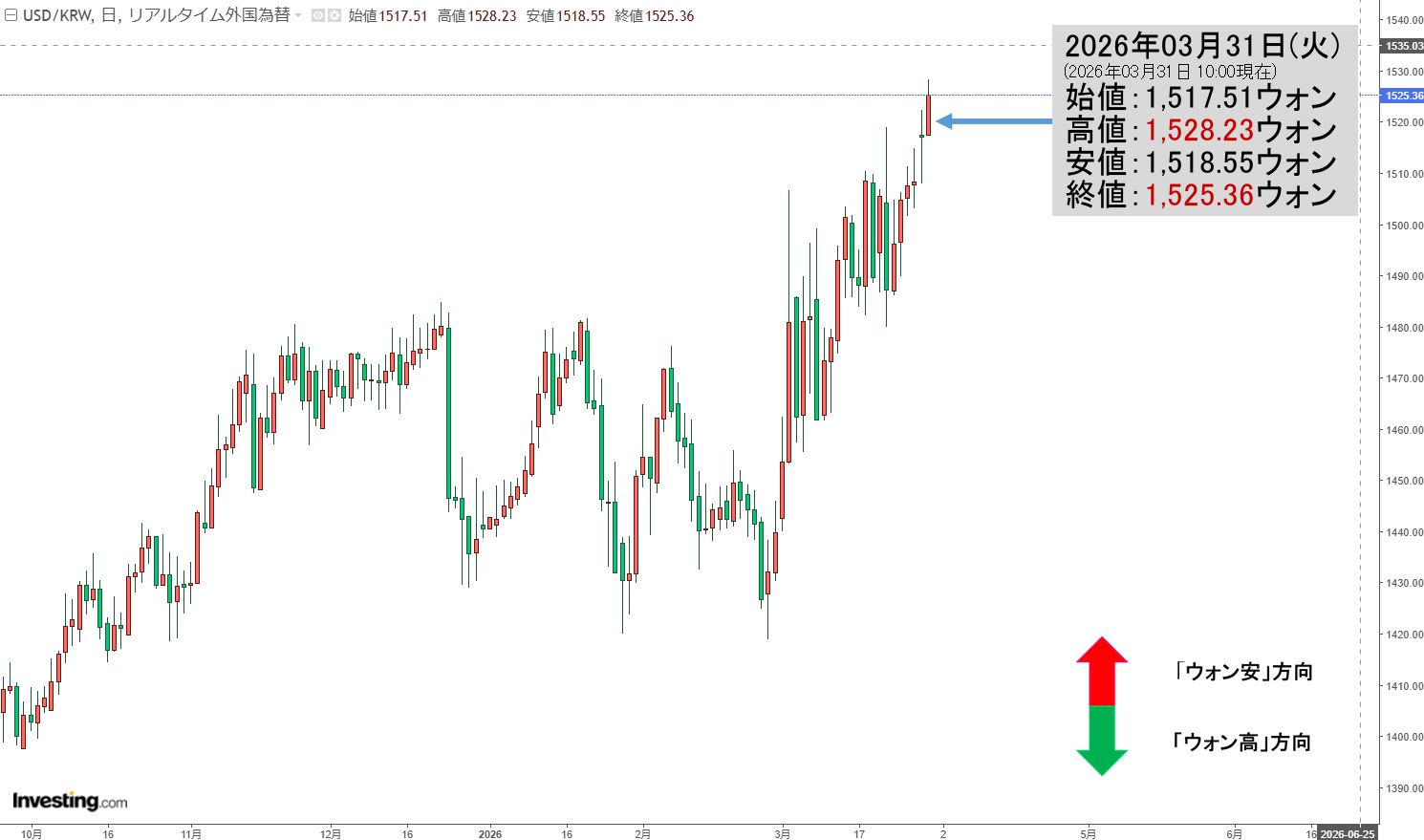 2026年03月31日(火)の市場が開きました。10:00現在、ドルウォンのチャートは以下のようになっています(チャートは『Investing.com』より引用)。