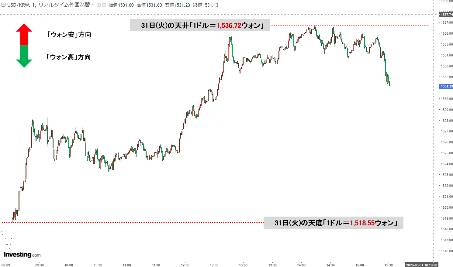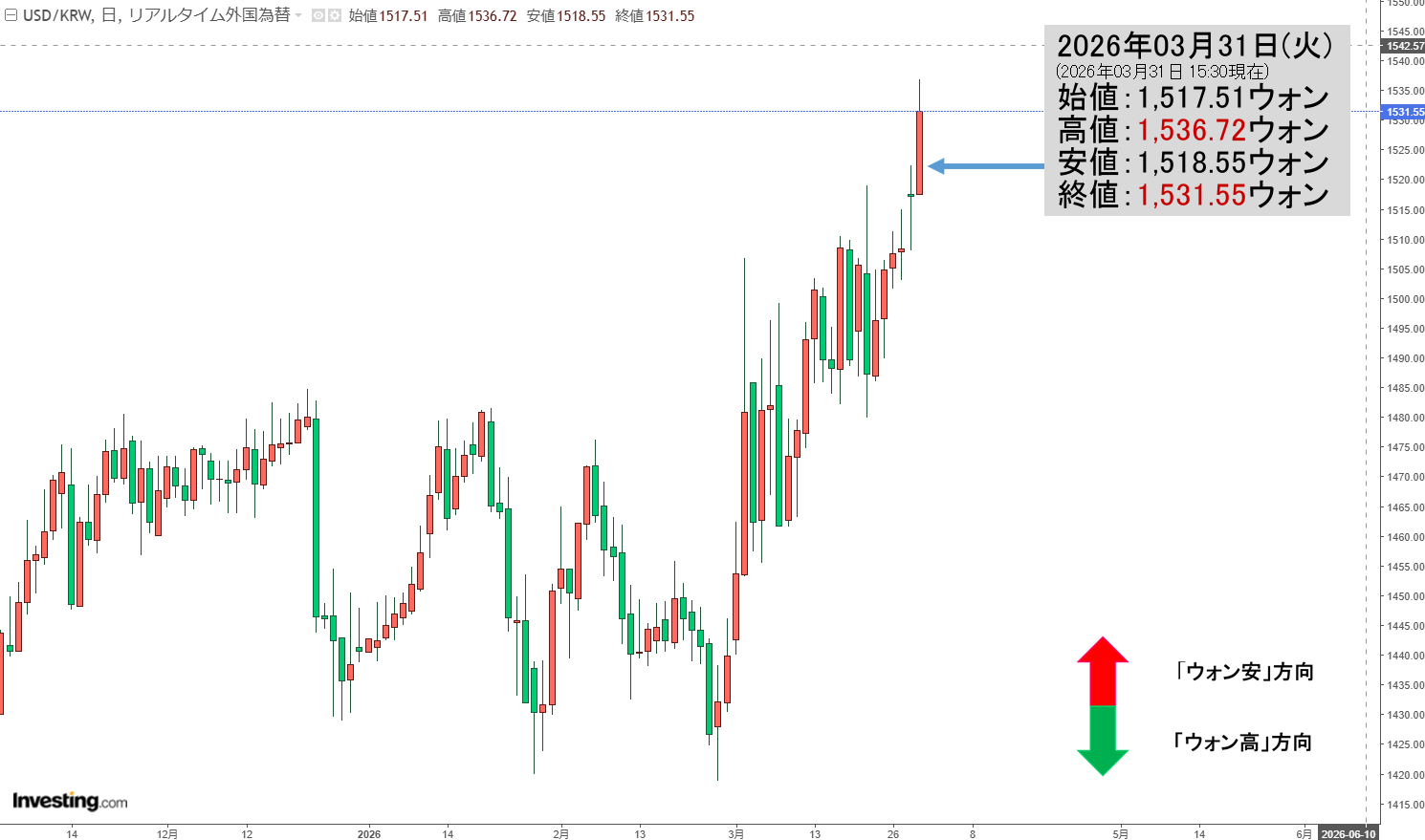 2026年03月31日(火)15:30現在、ドルウォンのチャートは以下のようになっています(チャートは『Investing.com』より引用)。