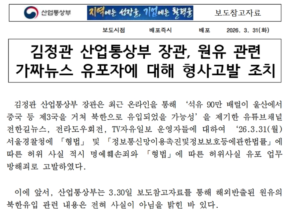 原油関連のフェイクニュース流布者に対し刑事告発措置金正官(キム·ジョングァン)産業通商部長官は、最近オンラインを通じて「石油90万バレルが蔚山から中国など第三国を経由して北朝鮮に流入した可能性」を提起したYouTubeチャンネル「チョン・ハンギルニュース」「全羅道右折」「TV自由日報」の運営者らに対し、‘26.03.31(月)にソウル警察庁へ「刑法」および「情報通信網利用促進及び情報保護などに関する法律」に基づく虚偽事実摘示による名誉毀損罪と、「刑法」に基づく虚偽事実流布による業務妨害罪で告発した。