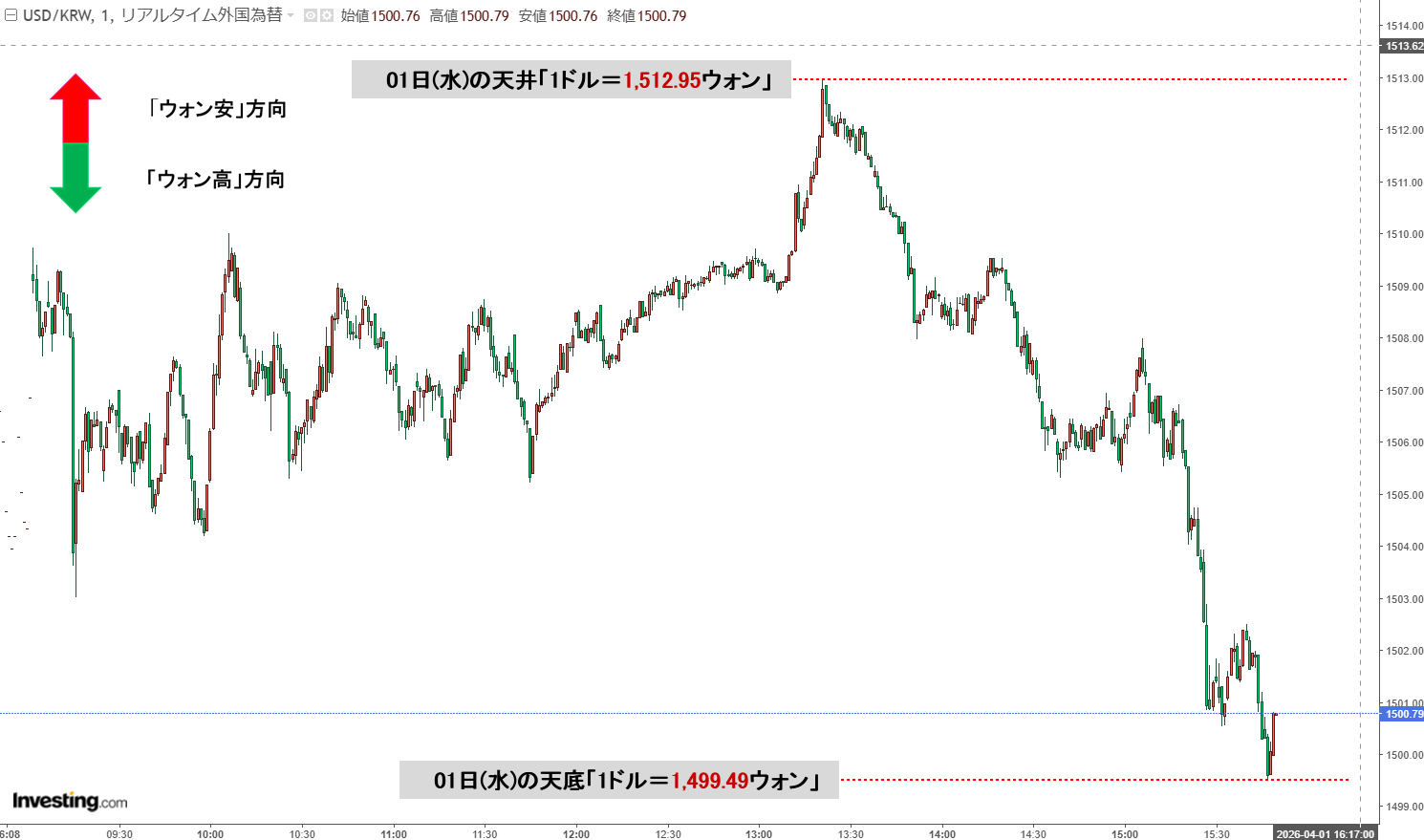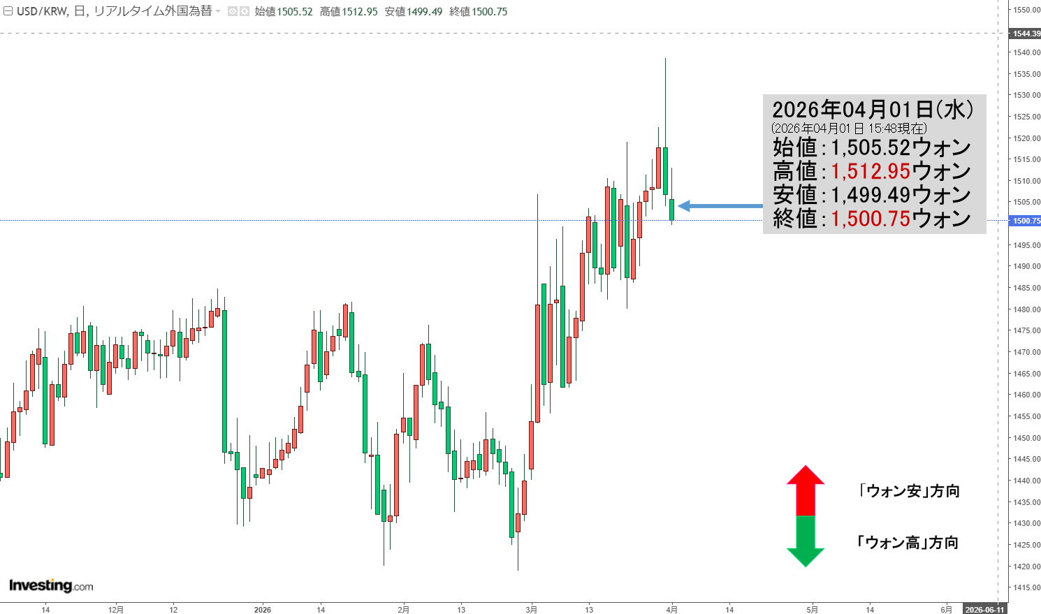 2026年04月02日(木)の市場が開きました。10:00現在、ドルウォンのチャートは以下のようになっています(チャートは『Investing.com』より引用)。現在のところ「1ドル=1,509ウォン」近辺の攻防となっています。ローソク足...