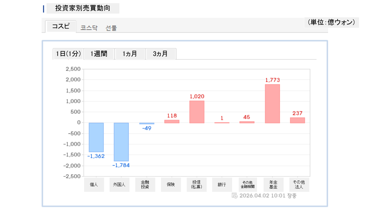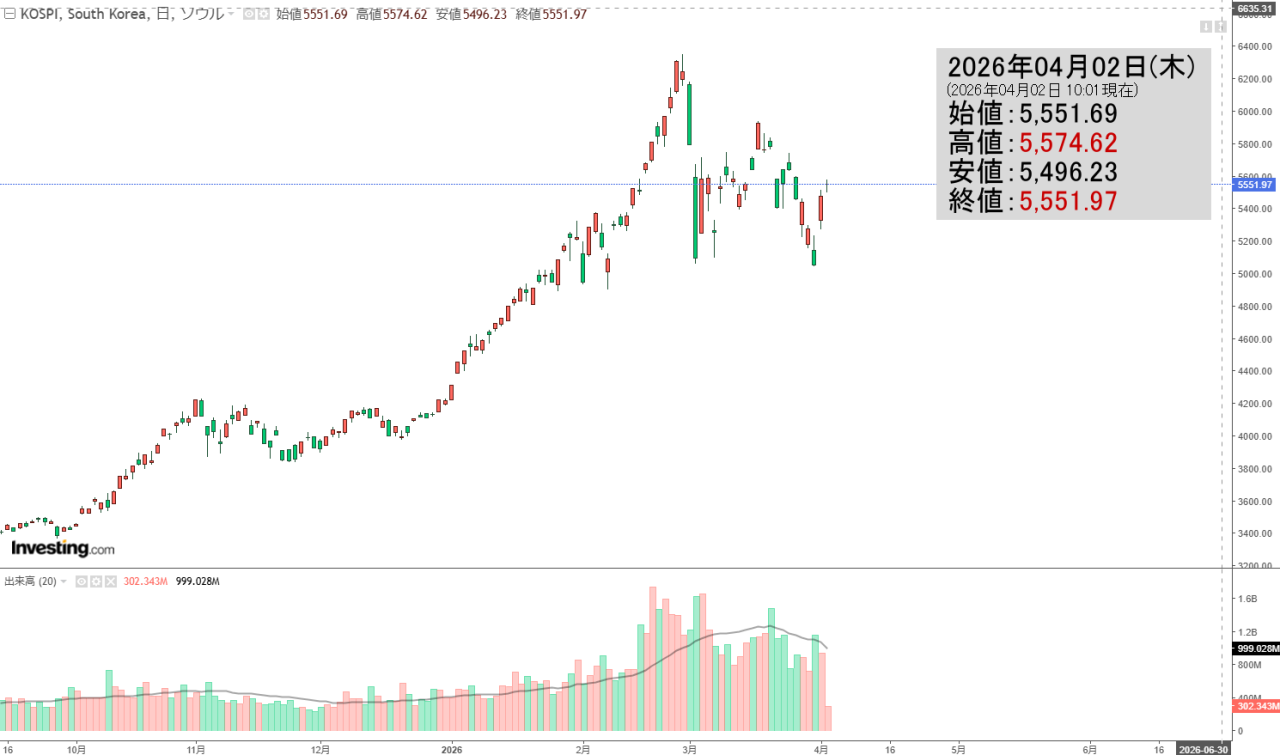 2026年04月02日(木)の韓国株式市場が開きました。10:01現在、KOSPI(韓国総合株価指数)のチャートは以下のようになっています(チャートは『Investing.com』より引用)。