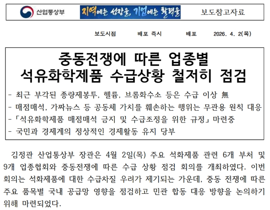 2026年04月02日、韓国の産業通商資源部が「중동전쟁에 따른 업종별 석유화학제품 수급상황 철저히 점검(中東戦争に伴う業種別 石油化学製品の需給状況を徹底点検)」というプレスリリースを出しました。