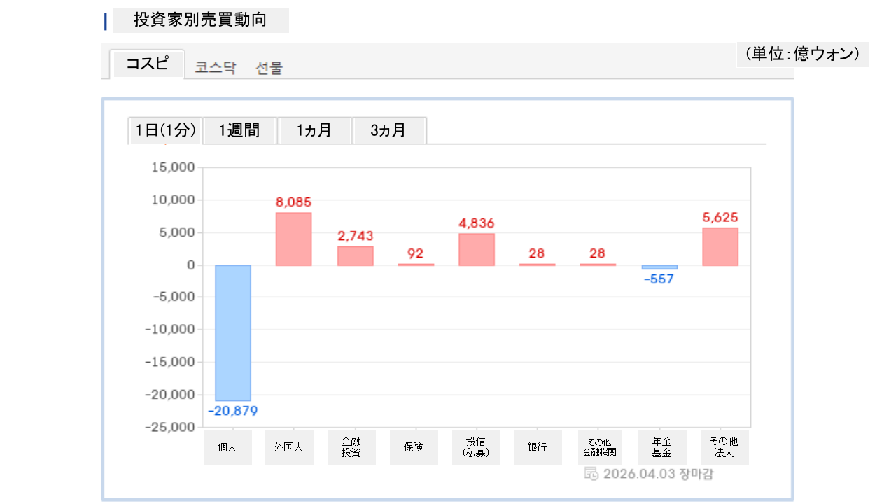 個人投資家は「2兆879億ウォン」の売り越し、外国人投資家は「8,085億ウォン」の買い越しです。