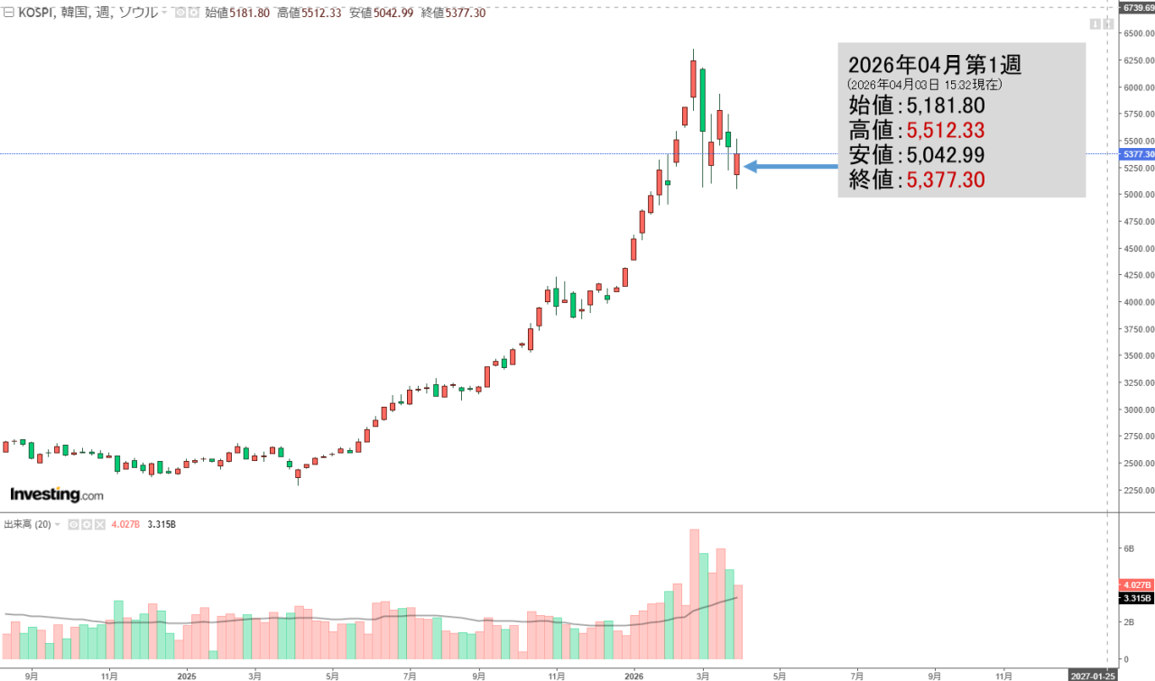 2026年04月03日(金)の韓国株式市場が締まりました。15:32現在、KOSPI(韓国総合株価指数)のチャートは以下のようになっています(チャートは『Investing.com』より引用)。