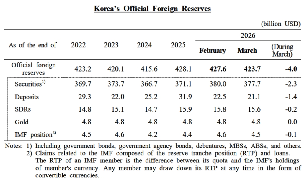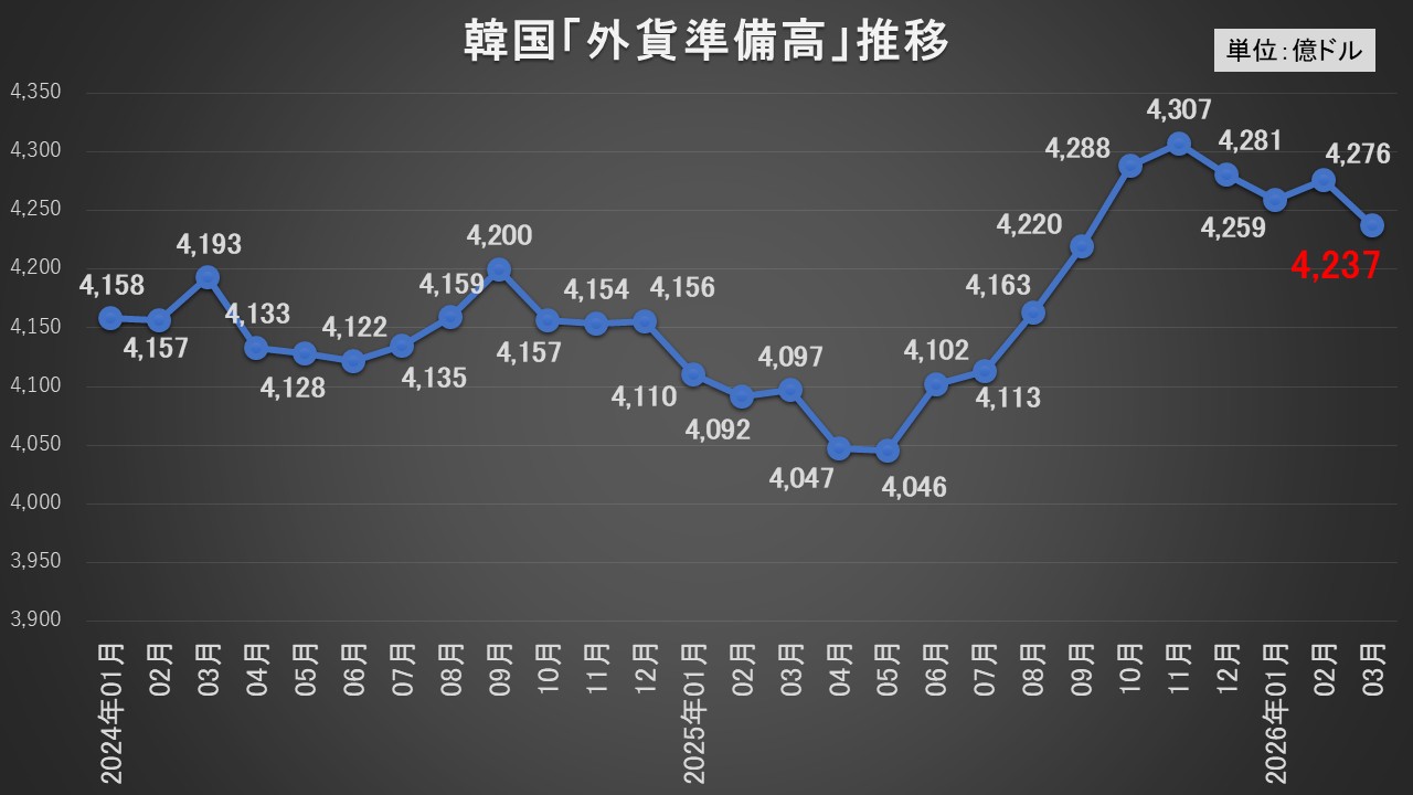 2026年04月03日、『韓国銀行』が「2026年03月末時点での外貨準備高」を公表しました。