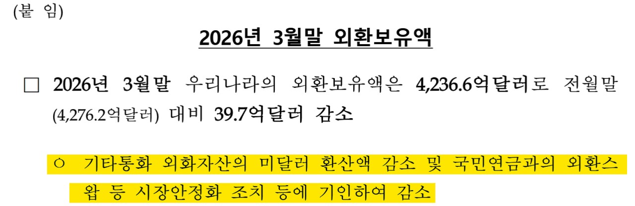 □2026年03月末、我が国の外貨準備高は4,236.6億ドルで、前月末(4,276.2億ドル)比39.7億ドル減少○その他通貨の外貨資産のドル換算額の減少および国民年金との外貨スワップなど市場安定化措置などに起因して減少