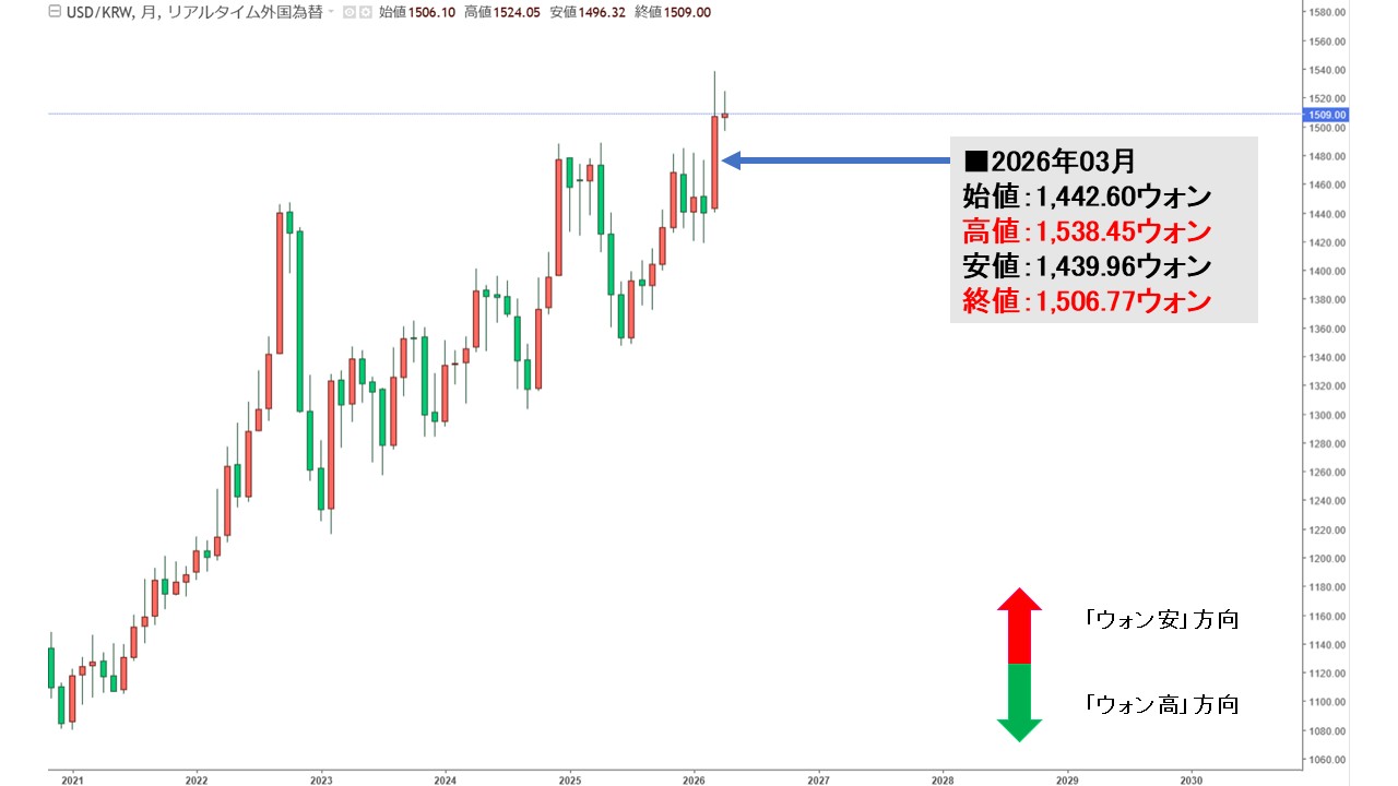 2026年03月は無茶苦茶にウォン安が進行しました。ドルウォンチャートをローソク足1本が1カ月の値動きを示す「月足」にすると以下のようになります(チャートは『Investing.com』より引用:以下同)。
