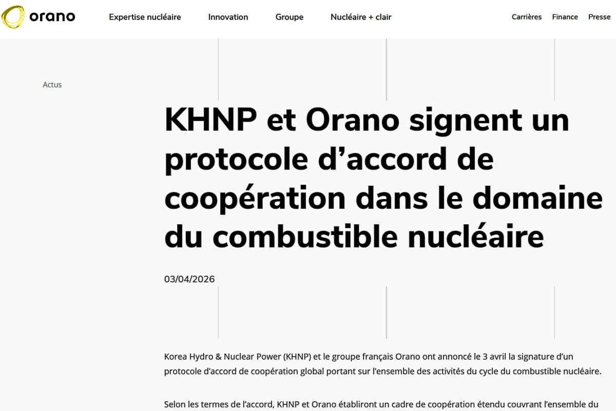 コリア・ハイドロ&ニュークリア・パワー(韓国水力原子力発電:KHNP)とフランスの『ORANO』グループは4月3日、核燃料サイクルの全活動に関わる包括的な協力覚書の署名を発表した。