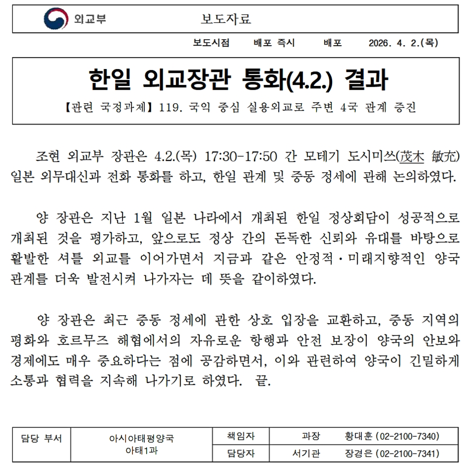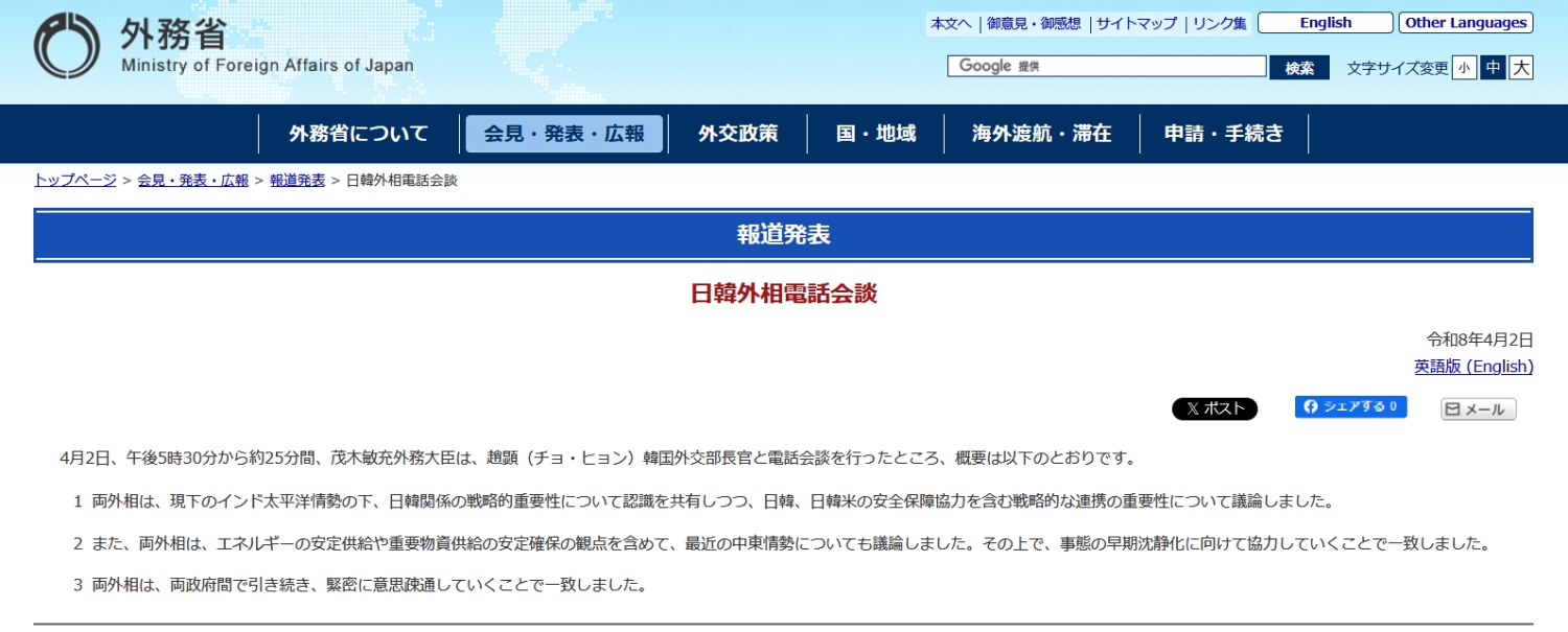 2026年04月02日、日本の茂木敏充外務大臣と韓国外交部の趙顕(チョ・ヒョン)部長(長官)が電話会談を行いました。