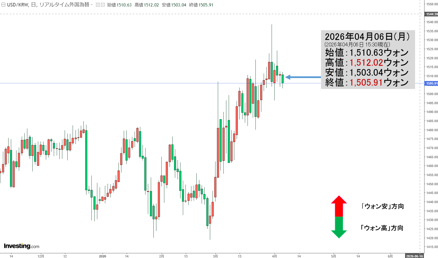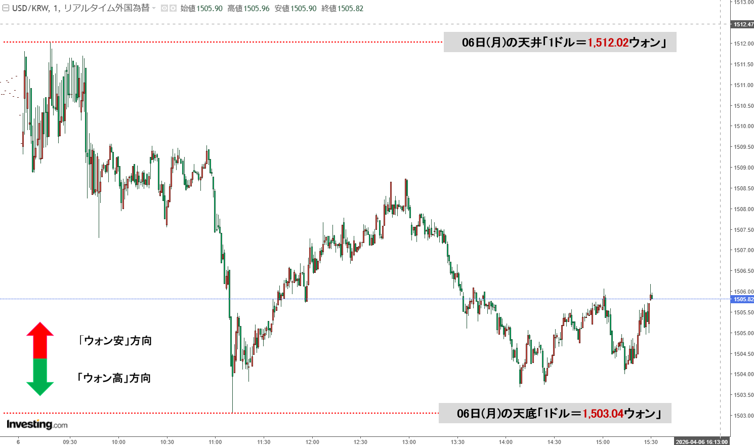現在のところ「1ドル=1,505ウォン」近辺の攻防となっています。