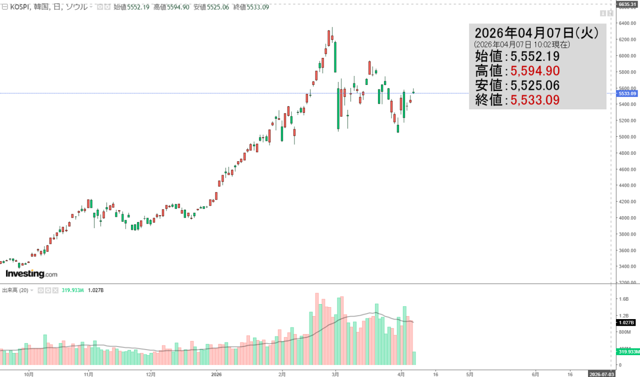 2026年04月07日(火)の韓国株式市場が開きました。10:02現在、KOSPI(韓国総合株価指数)のチャートは以下のようになっています(チャートは『Investing.com』より引用)。