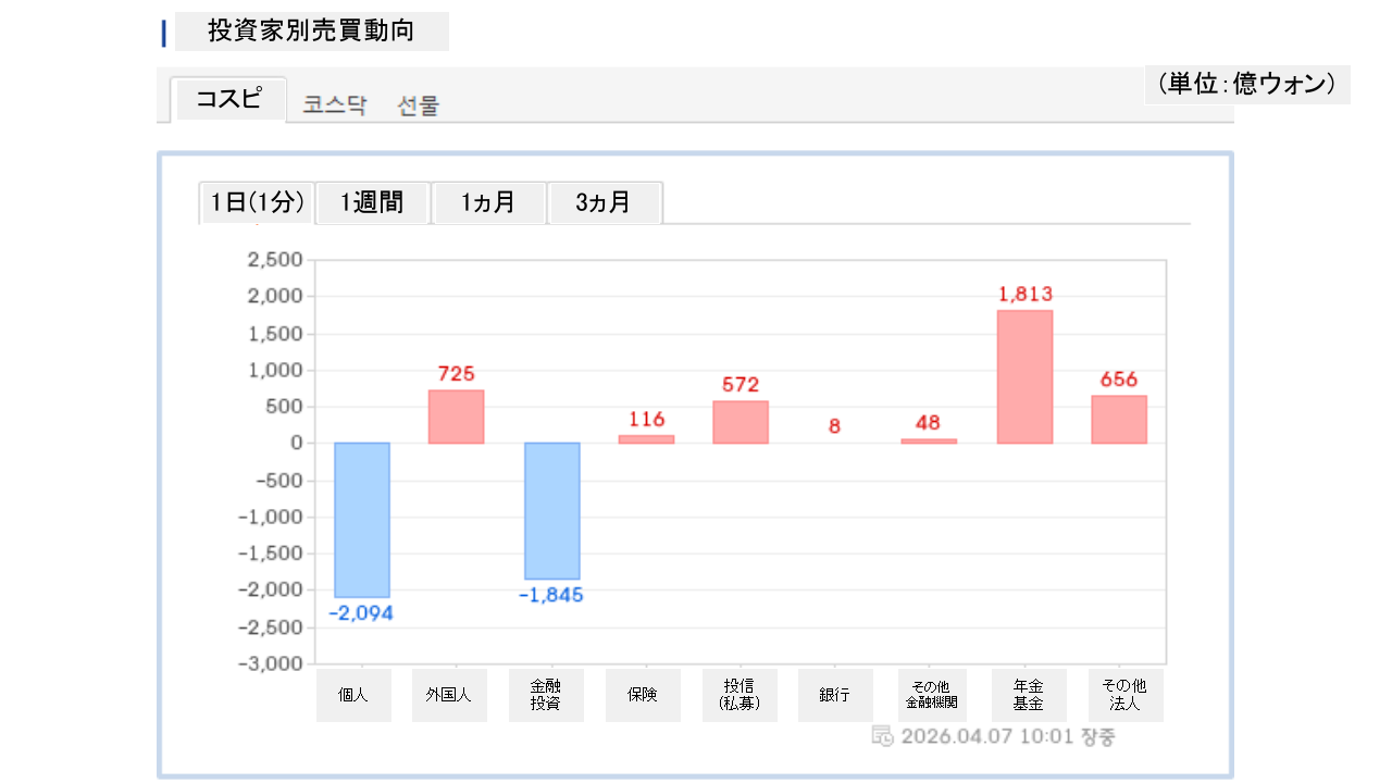 個人投資家は「2,094億ウォン」の売り越し、外国人投資家は「725億ウォン」の買い越しです。
