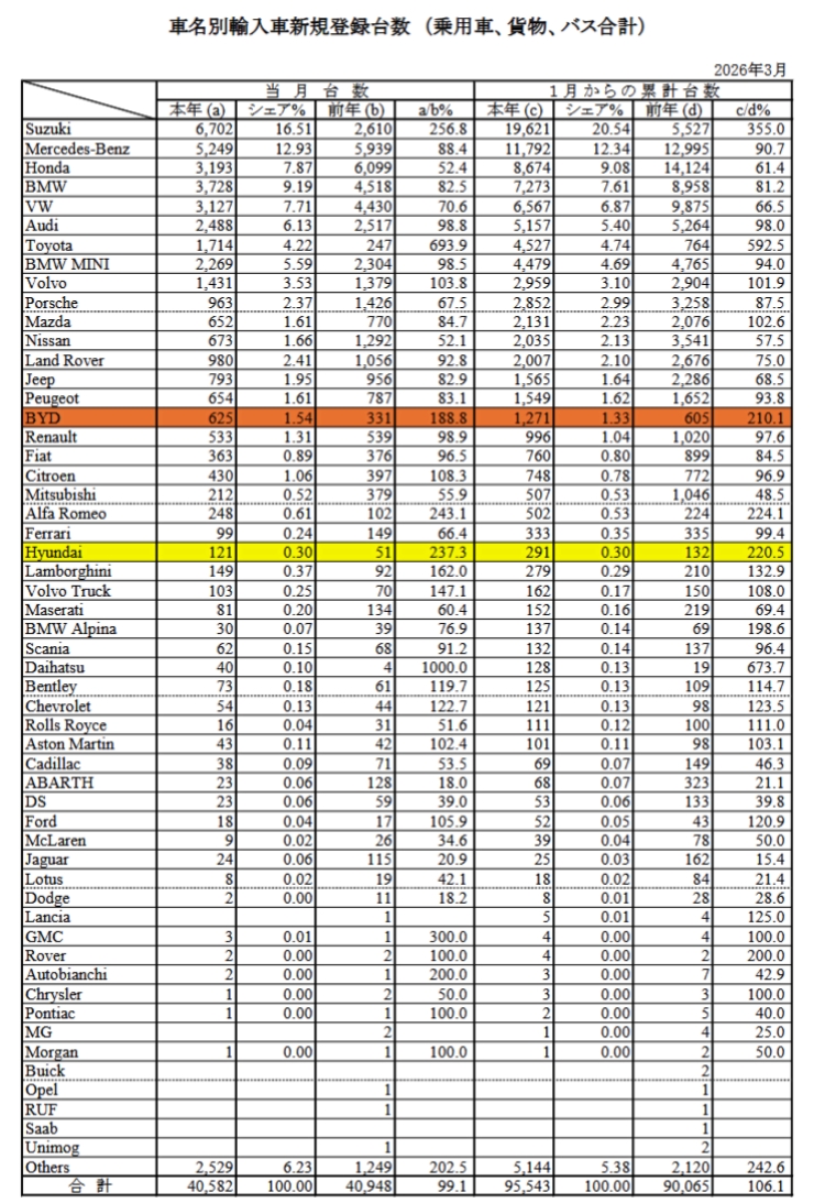 2026年03月における、中国の電気自動車メーカー『BYD』、韓国の『現代自動車』の日本市場での動向を見てみましょう。