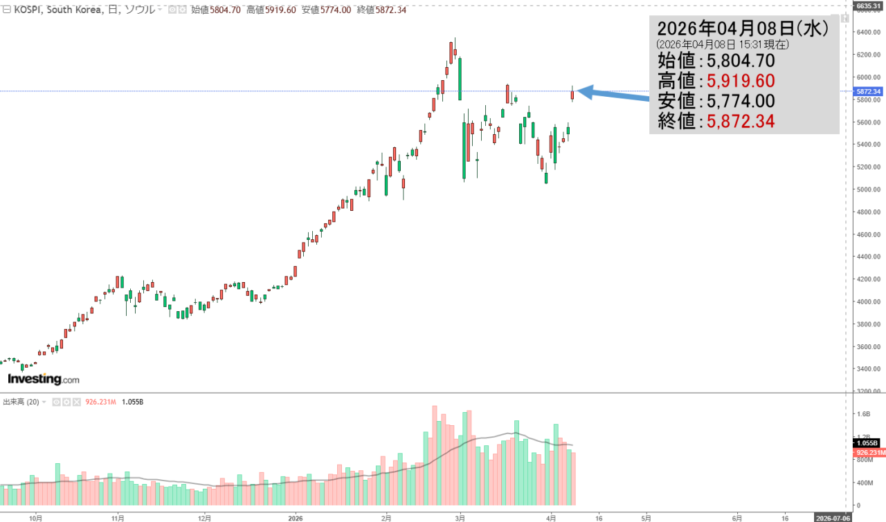 2026年04月09日(木)の韓国株式市場が開きましたので、KOSPIチャートの初動状況を以下の記事にまとめました。本記事と併せてお読み頂ければ幸いです。